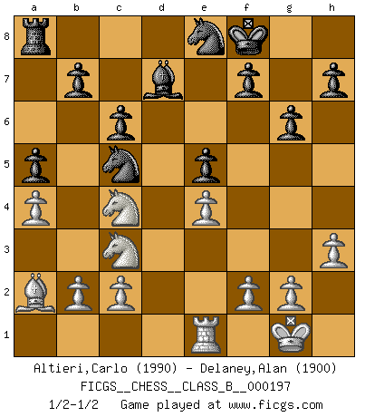 Last move : 1/2-1/2 2014 March 3 1:27:39 [Event "FICGS__CHESS__CLASS_B__000197"] [Site "FICGS"] [Date "2013.10.09"] [Round "1"] [White "Altieri,Carlo"] [Black "Delaney,Alan"] [Result "1/2-1/2"] [WhiteElo "1990"] [BlackElo "1900"] 1.e4 d6 2.d4 Nf6 3.Nc3 e5 4.Nf3 Nbd7 5.Bc4 Be7 6.O-O O-O 7.Re1 c6 8.a4 a5 9.h3 Qe8 10.Bg5 Bd8 11.Ba2 Nb6 12.dxe5 dxe5 13.Qd6 Nbd7 14.Rad1 Qe7 15.Qxe7 Bxe7 16.Nh4 g6 17.Bh6 Re8 18.Nf3 Bf8 19.Bxf8 Kxf8 20.Rd6 Re7 21.Nd2 Ne8 22.Rd3 Nc5 23.Rd8 Rd7 24.Rxd7 Bxd7 25.Nc4 1/2-1/2 Pirc defense Kingside Castling by player White (move 6) Kingside Castling by player Black (move 6) This chess game ended in a draw. Follow this game move after move (download)The laws of Chess do not permit a free choice: you have to move whether you like it or not. (Emanuel Lasker) Taktik ist was man tun muß, wenn etwas zu tun ist. Strategie ist was man tun muß, wenn nichts zu tun ist. (Savielly Grigorievitsch Tartakower) El Ajedrez no es una pizca de inferior al violín, y tenemos un gran número de violinistas profesionales. (Mikhail Botvinnik) Les sacrifices démontrent seulement que quelqu'un a gaffé. (Savielly Tartacover) The human is the only animal species whose members are able to talk themselves into difficulties that would not otherwise exist. (Wendell Johnson)