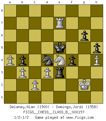 Last move : 1/2-1/2 2015 March 1 12:42:13 [Event "FICGS__CHESS__CLASS_B__000197"] [Site "FICGS"] [Date "2013.10.09"] [Round "1"] [White "Delaney,Alan"] [Black "Domingo,Jordi"] [Result "1/2-1/2"] [WhiteElo "1900"] [BlackElo "1958"] 1.Nf3 b5 2.g3 Bb7 3.Bg2 e6 4.O-O c5 5.d3 Nf6 6.e4 d6 7.a4 b4 8.Nbd2 Be7 9.Nc4 O-O 10.Re1 Qc7 11.Bf4 Nc6 12.e5 Nxe5 13.Nfxe5 Bxg2 14.Kxg2 dxe5 15.Bxe5 Qc6+ 16.Qf3 Nd5 17.b3 f6 18.Bb2 e5 19.Re4 Rad8 20.Rae1 Rd7 21.Rh4 Rfd8 22.Kg1 Bf8 23.Qe4 g6 24.Qg2 Qb7 25.Rhe4 Bg7 26.h4 h5 27.f4 f5 28.R4e2 exf4 29.Bxg7 Rxg7 30.Re8+ Rxe8 31.Rxe8+ Kh7 32.Re5 Rd7 33.gxf4 Nxf4 34.Qxb7 Rxb7 35.Rxc5 Ne6 36.Rd5 Nf4 37.Re5 Kg7 38.Ra5 Ne2+ 39.Kf1 Nd4 40.Nd6 Re7 41.Nc8 Re3 42.Rxa7+ Kf6 43.Nb6 Rf3+ 44.Kg2 f4 45.Nd7+ Ke6 46.Nc5+ Ke5 47.Ne4 Re3 48.Re7+ Kd5 49.Rd7+ Ke5 50.Re7 Kd5 51.Rd7+ Ke5 52.Re7+ 1/2-1/2 Reti Opening Kingside Castling by player White (move 4) Kingside Castling by player Black (move 9) This chess game ended in a draw. Follow this game move after move (download)Discovered check is the dive bomber of the Chessboard. (Reuben Fine) Ich war zu klein für die Schach-Schülermannschaft! (Woody Allen) Yo creo que el Ajedrez posee una magia que es también una ayuda en la edad avanzada. Una rodilla reumática es olvidada durante una partida de Ajedrez y otros eventos pueden parecer algo sin importancia comparada a una catástrofe en el tablero de Ajedrez. (Vlastimil Hort) Toutes choses étant égales, c'est la conviction qui gagne. Alliée à une volonté de vaincre, elle sert de détonateur, suscite des idées, disperse les doutes et aide à penser clairement. (Robert Fischer) You must do what you feel is right... of course. (Obi-Wan Kenobi in Star Wars ep.4)