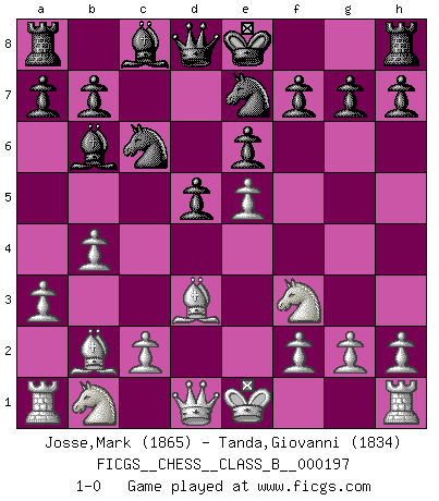 Last move : 1-0 2013 November 29 8:9:12 [Event "FICGS__CHESS__CLASS_B__000197"] [Site "FICGS"] [Date "2013.10.09"] [Round "1"] [White "Josse,Mark"] [Black "Tanda,Giovanni"] [Result "1-0"] [WhiteElo "1865"] [BlackElo "1834"] 1.e4 c6 2.d4 d5 3.e5 c5 4.dxc5 e6 5.a3 Bxc5 6.Nf3 Ne7 7.Bd3 Nbc6 8.b4 Bb6 9.Bb2 1-0 This chess game has been lost on time (started : 2013.10.09 16:23:54) Caro-Kann : Advance variation Player White won this chess game. Follow this game move after move (download)There are two types of sacrifices: correct ones and mine. (Mikhail Tal) Schach verlangt totale Konzentration. (Robert James Fischer) Ayuda a tus piezas para que ellas te puedan ayudar. (Paul Morphy) La vérité est comme le meilleur coup aux échecs : elle existe, mais il faut la chercher. (Arturo Perez-Reverte) I can't decide which is riskier; taking crazy risks, or taking advice on crazy risks from a crazy risk taker. (Gregory House in House M.D.)