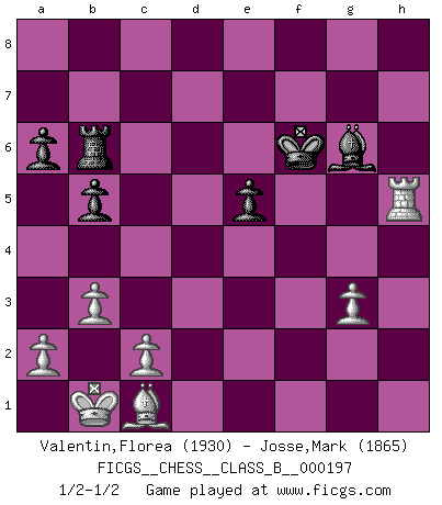 Last move : 1/2-1/2 2014 February 22 23:28:53 [Event "FICGS__CHESS__CLASS_B__000197"] [Site "FICGS"] [Date "2013.10.09"] [Round "1"] [White "Valentin,Florea"] [Black "Josse,Mark"] [Result "1/2-1/2"] [WhiteElo "1930"] [BlackElo "1865"] 1.e4 c5 2.Nf3 e6 3.d4 cxd4 4.Nxd4 Nc6 5.Nc3 Qc7 6.Be3 a6 7.Qd2 Nf6 8.O-O-O Be7 9.f3 O-O 10.g4 b5 11.g5 Nh5 12.Nce2 Nxd4 13.Qxd4 f5 14.Kb1 f4 15.Bd2 Bxg5 16.Bb4 Bf6 17.Qg1 Rf7 18.Bd6 Qa7 19.Qg4 g6 20.Nxf4 Nxf4 21.Bxf4 e5 22.Bc1 Qf2 23.Qg3 Qxg3 24.hxg3 Be7 25.Be2 d6 26.b3 Be6 27.Rd3 Rb8 28.Rc3 Bd8 29.Rd1 Rc7 30.Rcd3 Bc4 31.Rxd6 Bxe2 32.Rxd8+ Kf7 33.R8d7+ Rxd7 34.Rxd7+ Ke6 35.Ra7 Rb6 36.f4 h5 37.Rh7 Bf3 38.f5+ Kf6 39.fxg6 Bxe4 40.Rxh5 Bxg6 1/2-1/2 Sicilian : Taimanov variation Queenside Castling by player White (move 8) Kingside Castling by player Black (move 9) This chess game ended in a draw. Follow this game move after move (download)The most powerful weapon in Chess is to have the next move. (David Bronstein) Ich organisiere ein großes Turnier, was mich etwa 120000 Dollar kostet. Ich denke, das ist das erste Mal in der Schachgeschichte, daß ein Schachgroßmeister auch als Mäzen auftritt. (Miguel Najdorf) La estratégia requiere pensar, la táctica requiere observación. (Max Euwe) Les échecs sont un jeu terrible. Si vous n'avez pas le centre, votre adversaire a une position plus libre. Par contre, si vous avez le centre, alors vous avez vraiment quelque chose pour laquelle vous inquiéter ! (Siegbert Tarrasch) My poor ole parrot... Is not in the circulation of displays ....poo hoo hoo :) (Wayne Lowrance's enigma)