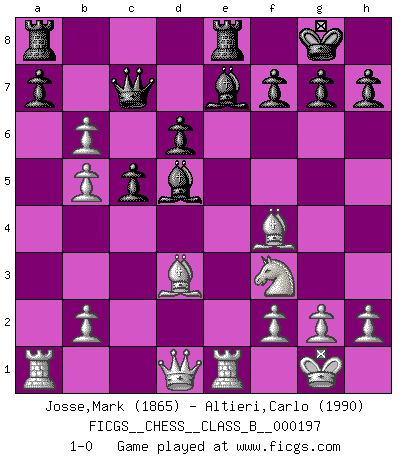 Last move : 1-0 2013 October 22 21:12:4 [Event "FICGS__CHESS__CLASS_B__000197"] [Site "FICGS"] [Date "2013.10.09"] [Round "1"] [White "Josse,Mark"] [Black "Altieri,Carlo"] [Result "1-0"] [WhiteElo "1865"] [BlackElo "1990"] 1.d4 Nf6 2.c4 c5 3.d5 b5 4.cxb5 e6 5.Nc3 exd5 6.Nxd5 Bb7 7.e4 Nxd5 8.exd5 Qe7+ 9.Be2 d6 10.Nf3 Qc7 11.O-O Be7 12.Re1 Nd7 13.Bd3 Bxd5 14.Bf4 Nb6 15.a4 O-O 16.a5 Rfe8 17.axb6 1-0 Benko gambit Kingside Castling by player White (move 11) Kingside Castling by player Black (move 15) Player White won this chess game. Follow this game move after move (download)The essence of Chess is thinking about what Chess is. (David Bronstein) Schach ist ein Kampf gegen den Fehler. (Johannes Herrman Zukertort) La partida mas dura de ganar es una partida ganada. (Emanuel Lasker) Avant la finale, les dieux ont créé le milieu de partie. (Tarrasch) The worth of a book is to be measured by what you can carry away from it. (James Bryce)