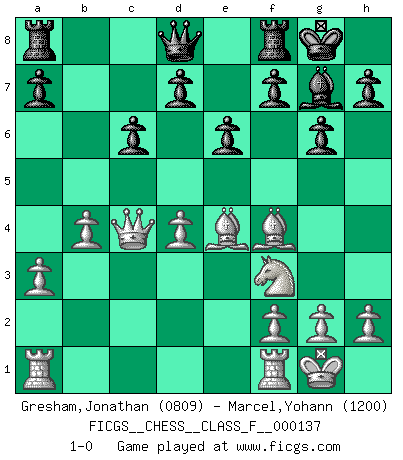 Last move : 1-0 2014 January 5 10:32:45 [Event "FICGS__CHESS__CLASS_F__000137"] [Site "FICGS"] [Date "2013.10.10"] [Round "1"] [White "Gresham,Jonathan"] [Black "Marcel,Yohann"] [Result "1-0"] [WhiteElo "0809"] [BlackElo "1200"] 1.c4 Nf6 2.d4 Nc6 3.Nf3 g6 4.Nc3 Bg7 5.Bf4 O-O 6.e4 b6 7.Bd3 Bb7 8.O-O Nb4 9.Bb1 Bxe4 10.Nxe4 Nxe4 11.Bxe4 c6 12.a3 Na6 13.b4 e6 14.Qa4 b5 15.Qxa6 bxc4 16.Qxc4 1-0 This chess game has been lost on time (started : 2013.10.10 6:37:49) English, 1...Nf6 (Anglo-Indian defense) Kingside Castling by player Black (move 5) Kingside Castling by player White (move 8) Player White won this chess game. Follow this game move after move (download)The game of Chess is not merely an idle amusement; several very valuable qualities of the mind are to be acquired and strengthened by it, so as to become habits ready on all occasions; for life is a kind of Chess. (Benjamin Franklin) Dass jemand wie Surab Asmaiparaschwili, der selbst Elopunkte gekauft hat , Vize-Präsident der Fide werden konnte, sagt schon einges über den Zustand dieser Organisation aus. (Joel Lautier) Una buena memoria, concentración, imaginación y una fuerte voluntad, se requiere para llegar a ser un buen jugador. (Bobby Fischer) L'ordinateur a tué l'originalité. Il n'y a plus guère d'aventures sur l'échiquier. (Jacob Murray) Nothing is more important for teaching us to understand the concepts we have than constructing fictitious ones. (Ludwig Wittgenstein)