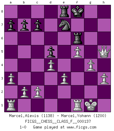 Last move : 1-0 2013 October 13 15:36:42 [Event "FICGS__CHESS__CLASS_F__000137"] [Site "FICGS"] [Date "2013.10.10"] [Round "1"] [White "Marcel,Alexis"] [Black "Marcel,Yohann"] [Result "1-0"] [WhiteElo "1138"] [BlackElo "1200"] 1.d4 Nf6 2.Nc3 g6 3.Bg5 d5 4.Nf3 Bg7 5.e3 O-O 6.Bd3 Bg4 7.O-O Nc6 8.a3 e6 9.h3 Bxf3 10.Qxf3 h5 11.Ne2 Qe7 12.Nf4 Rfd8 13.Nxg6 Qe8 14.Bxf6 Bxf6 15.Qxf6 fxg6 16.Bxg6 Qxg6 17.Qxg6+ Kf8 18.f4 Ne7 19.Qxe6 Rd6 20.Qe5 Re8 21.Qxh5 Rg6 22.f5 Rf6 23.g4 1-0 Queen's pawn game Kingside Castling by player Black (move 5) Kingside Castling by player White (move 7) Player White won this chess game. Follow this game move after move (download)Examine moves that smite! A good eye for smites is far more important than a knowledge of strategical principles. (Purdy) Warum muß ich gegen diesen IDIOTEN verlieren? (Aaron Nimzowitsch) La estratégia requiere pensar, la táctica requiere observación. (Max Euwe) Les échecs, c'est l'art d'analyser. (Mikhail Botvinnik) Work expands to fill the time available. (C. Northcote Parkinson, in Parkinson's Laws)