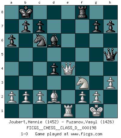 Last move : 1-0 2014 January 13 22:54:44 [Event "FICGS__CHESS__CLASS_D__000198"] [Site "FICGS"] [Date "2013.10.10"] [Round "1"] [White "Joubert,Hennie"] [Black "Puzanov,Vasyl"] [Result "1-0"] [WhiteElo "1452"] [BlackElo "1426"] 1.e4 e5 2.Nf3 Nc6 3.Bc4 Nf6 4.d4 exd4 5.O-O Nxe4 6.Re1 d5 7.Bxd5 Qxd5 8.Nc3 Qh5 9.Nxe4 Be6 10.Neg5 O-O-O 11.Nxe6 fxe6 12.Rxe6 Bd6 13.Bd2 Rde8 14.Qe2 Rxe6 15.Qxe6+ Kb8 16.Re1 a6 17.h3 Rf8 18.Qe4 1-0 This chess game has been lost on time (started : 2013.10.10 11:41:12) Two knights defense Kingside Castling by player White (move 5) Queenside Castling by player Black (move 10) Player White won this chess game. Follow this game move after move (download)Chess is war over the board. The object is to crush the opponents mind. (Bobby Fischer) Wer mein Gambit spielt, muß bereit sein, alle Brücken hinter sich abzubrechen. Es verändert den ganzen Menschen. Es wirkt wie ein Zauberstab und fördert verkümmerte, gute Charakter- eigenschaften wieder zu Tage. (Emil Joseph Diemer) Cualquier cambio de material en una posición debe venir por medio de un mate, una captura o promoción de Peón. (Purdy) Toute estimation doit être constamment réévaluée. (Jacob Estrin) Tree pose grows confidence. It roots me to this world. (Terri Guillemets)
