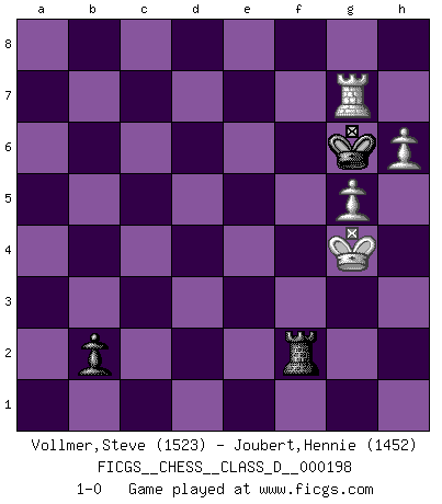 Last move : 1-0 2013 November 18 16:15:8 [Event "FICGS__CHESS__CLASS_D__000198"] [Site "FICGS"] [Date "2013.10.10"] [Round "1"] [White "Vollmer,Steve"] [Black "Joubert,Hennie"] [Result "1-0"] [WhiteElo "1523"] [BlackElo "1452"] 1.d4 Nf6 2.c4 c5 3.d5 b5 4.e3 g6 5.Nf3 Bg7 6.Nc3 b4 7.Ne2 O-O 8.Ng3 d6 9.Bd3 Bg4 10.h3 Bxf3 11.Qxf3 Nbd7 12.O-O Ne5 13.Qe2 Nxd3 14.Qxd3 a5 15.Rb1 a4 16.Bd2 Qd7 17.f4 Rfd8 18.f5 e6 19.dxe6 fxe6 20.fxg6 h6 21.e4 Qe8 22.Bxh6 Qxg6 23.Bxg7 Kxg7 24.Rf3 d5 25.exd5 exd5 26.cxd5 Rxd5 27.Qxg6+ Kxg6 28.Rbf1 Ra6 29.R3f2 Rg5 30.Ne2 Ne4 31.Rf4 Re6 32.g4 Rge5 33.Rxe4 Rxe4 34.Nf4+ Rxf4 35.Rxf4 Re2 36.Rf2 Re3 37.Kg2 c4 38.Rc2 c3 39.bxc3 Rxc3 40.Rd2 b3 41.axb3 axb3 42.Rd6+ Kf7 43.Rb6 Rc2+ 44.Kg3 b2 45.h4 Kg7 46.h5 Re2 47.g5 Rc2 48.h6+ Kh7 49.Kg4 Rg2+ 50.Kf5 Rf2+ 51.Ke4 Rg2 52.Kf4 Rf2+ 53.Kg3 Rf5 54.Kg4 Rf2 55.Rb7+ Kg6 56.Rg7+ 1-0 Benko gambit Kingside Castling by player Black (move 7) Kingside Castling by player White (move 12) 10 pieces endgame at move 39 : White KRPPPP , Black KRPP WHITE : King + 1 Rook 4 Pawns BLACK : King + 1 Rook 2 Pawns 9 pieces endgame at move 39 : White KRPPP , Black KRPP WHITE : King + 1 Rook 3 Pawns BLACK : King + 1 Rook 2 Pawns 8 pieces endgame at move 41 : White KRPPP , Black KRP WHITE : King + 1 Rook 3 Pawns BLACK : King + 1 Rook 1 Pawn 7 pieces endgame at move 41 : White KRPP , Black KRP WHITE : King + 1 Rook 2 Pawns BLACK : King + 1 Rook 1 Pawn Player White won this chess game. Follow this game move after move (download)There's never before been a Chess player with such a thorough knowledge of the intricacies of the game and such an absolutely indomitable will to win. I think Bobby is the greatest player that ever lived. (Lisa Lane) Die Neutralität betrachte ich als eine schwere Krankheit. (Viktor Kortschnoi) El arma más poderosa en el Ajedrez, es tener la próxima movida. (David Bronstein) Si le désir cupide (et stupide) de gagner est une inépuisable source de souffrance, une combinaison brillante sur l'échiquier est une découverte : le coquelicot qui s'épanouit lorsque apparaît la Voie Lactée. (Arrabal) It is not true that people stop pursuing dreams because they grow old, they grow old because they stop pursuing dreams. (Gabriel Garcia Marquez)