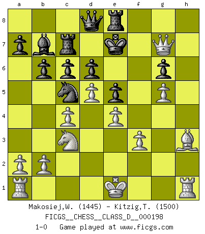 Last move : 1-0 2014 January 30 19:27:59 [Event "FICGS__CHESS__CLASS_D__000198"] [Site "FICGS"] [Date "2013.10.10"] [Round "1"] [White "Makosiej,Wladyslaw"] [Black "Kitzig,Tobias"] [Result "1-0"] [WhiteElo "1445"] [BlackElo "1500"] 1.d4 Nf6 2.c4 g6 3.Nc3 Bg7 4.e4 O-O 5.Be3 Re8 6.f3 d6 7.Nge2 Nbd7 8.Qd2 e5 9.d5 b6 10.g4 Bb7 11.h4 Nf8 12.h5 Rc8 13.hxg6 Nxg6 14.Bh6 c6 15.Bxg7 Kxg7 16.Qh6+ Kg8 17.g5 Nd7 18.Qxh7+ Kf8 19.Qh6+ Ke7 20.Ng3 Nc5 21.Bh3 Rc7 22.Nf5+ Kd7 23.Nh4 Ke7 24.Nxg6+ fxg6 25.Qg7+ 1-0 King's Indian : 4.e4 Kingside Castling by player Black (move 4) Player White won this chess game. Follow this game move after move (download)Chess is a beautiful mistress. (Bent Larsen) Ein unbeabsichtigtes Patt ist der Gipfel der Dummheit. (Anonymous) Una buena memoria, concentración, imaginación y una fuerte voluntad, se requiere para llegar a ser un buen jugador. (Bobby Fischer) RxDa4 pat (...) Wisdom begins at the end. (Daniel Webster)