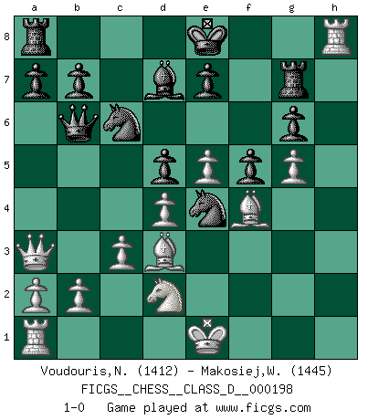 Last move : 1-0 2014 January 18 13:59:8 [Event "FICGS__CHESS__CLASS_D__000198"] [Site "FICGS"] [Date "2013.10.10"] [Round "1"] [White "Voudouris,Nick"] [Black "Makosiej,Wladyslaw"] [Result "1-0"] [WhiteElo "1412"] [BlackElo "1445"] 1.d4 g6 2.f4 d5 3.e3 Bg7 4.Bd3 Nh6 5.Nf3 c5 6.c3 O-O 7.h3 Qc7 8.g4 f5 9.g5 Nf7 10.h4 cxd4 11.exd4 Nd6 12.h5 Ne4 13.hxg6 hxg6 14.Ne5 Bxe5 15.fxe5 Kf7 16.Rh7+ Ke8 17.Bf4 Qb6 18.Qa4+ Bd7 19.Qa3 Nc6 20.Nd2 Rf7 21.Rh6 Rg7 22.Rh8+ 1-0 Modern defense Kingside Castling by player Black (move 6) Player White won this chess game. Follow this game move after move (download)Via the squares on the chessboard, the Indians explain the movement of time and the age, the higher influences which control the world and the ties which link Chess with the human soul. (Al-Masudi) Schach ist die gewalttätigste aller Sportarten. (Garry Kasparov) El Ajedrez te enseña a controlarl la excitación inicial que sientes cuando vez algo que parece bueno y te enseña a pensar objetivamente cuando te encuentras en problemas. (Stanley Kubrick) Le profane ne songe pas à la somme de jouissance dont il se prive, qui méconnaît ce jeu aux ressources aussi variées que passionnantes. (Jean-Marie Jeanton-Lamarche) Two beer, or not two beer. (Unknown)