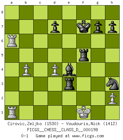Last move : 0-1 2013 November 25 14:18:53 [Event "FICGS__CHESS__CLASS_D__000198"] [Site "FICGS"] [Date "2013.10.10"] [Round "1"] [White "Cirovic,Zeljko"] [Black "Voudouris,Nick"] [Result "0-1"] [WhiteElo "1530"] [BlackElo "1412"] 1.e4 c5 2.Bc4 e6 3.c3 a6 4.d4 b5 5.Bb3 Bb7 6.d5 c4 7.dxe6 cxb3 8.exf7+ Kxf7 9.Qxb3+ Ke8 10.a4 Bxe4 11.Nf3 Bd3 12.Ne5 Qe7 13.Kd2 Be4 14.f4 Qd6+ 15.Ke2 Bd5 16.Qc2 Nc6 17.Re1 Be7 18.axb5 Nxe5 19.fxe5 Qxe5+ 20.Kd1 Qh5+ 21.Qe2 Bb3+ 22.Kd2 Qg5+ 23.Qe3 Qxg2+ 24.Qe2 Qg5+ 25.Qe3 Qxb5 26.Qe5 Qxe5 27.Rxe5 Nf6 28.Ke1 Kf7 29.Nd2 Bd6 30.Rea5 Rhe8+ 31.Kf1 Bc2 32.Nf3 Bd3+ 33.Kf2 Re2+ 34.Kg1 Rae8 35.Bg5 Be4 36.Rxa6 Bc5+ 37.Nd4 Rg2+ 38.Kf1 Rxg5 39.b4 Bxd4 40.cxd4 Bd3+ 41.Kf2 Re2+ 42.Kf3 Rf5+ 43.Kg3 Ne4+ 44.Kg4 Nf2+ 45.Kg3 Re3+ 46.Kg2 Be4+ 47.Kf1 Nh3 0-1 Sicilian defense Player Black won this chess game. Follow this game move after move (download)The Pin is mightier than the sword. (Fred Reinfeld) Viele Opfer benötigen überhaupt keine konkrete Berechnung. Es genügt sich die entstehende Position kurz vorzustellen, um uns davon zu überzeugen, dass das Opfer korrekt ist. (Mikhail Nekhemyevich Tal) El Ajedrez expande y enriquece tu mente. (Saudin Robovic) Toute estimation doit être constamment réévaluée. (Jacob Estrin) If things go wrong, don't go with them. (Roger Babson)