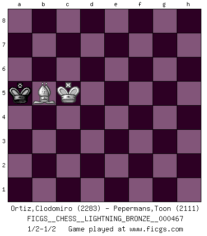 Last move : 1/2-1/2 2013 October 11 18:9:32 [Event "FICGS__CHESS__LIGHTNING_BRONZE__000467"] [Site "FICGS"] [Date "2013.10.11"] [Round "1"] [White "Ortiz,Clodomiro"] [Black "Pepermans,Toon"] [Result "1/2-1/2"] [WhiteElo "2283"] [BlackElo "2111"] 1.f4 d5 2.Nf3 g6 3.e3 Bg7 4.Nc3 Nf6 5.b4 O-O 6.Bb2 c6 7.Be2 Qd6 8.a3 Nbd7 9.Na4 Ne4 10.Qc1 Nb6 11.Be5 Bxe5 12.fxe5 Qc7 13.Nxb6 axb6 14.Qb2 f6 15.c4 fxe5 16.cxd5 cxd5 17.Rc1 Qd6 18.d3 Nf6 19.Nxe5 Nd7 20.Nxd7 Bxd7 21.Bf3 e5 22.O-O Kg7 23.Qb3 d4 24.Qd5 Qxd5 25.Bxd5 Bb5 26.Rc7+ Kh6 27.Rxf8 Rxf8 28.exd4 Bxd3 29.h4 exd4 30.Bf3 b5 31.Rd7 Rf4 32.Bxb7 Rxh4 33.g3 Bf5 34.Rd6 Rh5 35.Bc6 Bc2 36.Rxd4 Re5 37.Kf2 Kg5 38.Rd7 h6 39.Rd5 Rxd5 40.Bxd5 Kf5 41.Ke3 Ke5 42.Bc6 Ba4 43.Be8 g5 44.Bh5 Kd5 45.Be2 Ke5 46.Kd3 Kf5 47.Bf3 g4 48.Bc6 h5 49.Ke3 Kg5 50.Kf2 h4 51.gxh4+ Kxh4 52.Kg2 Kg5 53.Kg3 Kf5 54.Be8 Ke4 55.Kxg4 Bd1+ 56.Kg5 Be2 57.Kf6 Kd4 58.Ke7 Kc3 59.Kd6 Kb3 60.Kc5 Ka4 61.Bd7 Bd3 62.Kd4 Kxa3 63.Kc3 Ka4 64.Bc6 Ka3 65.Kxd3 Kxb4 66.Bxb5 Kc5 67.Kc3 Kb6 68.Kb4 Kc7 69.Kc5 Kd8 70.Kd6 Kc8 71.Ke7 Kc7 72.Ke6 Kb6 73.Kd6 Ka5 74.Kc5 1/2-1/2 Bird's Opening Kingside Castling by player Black (move 5) Kingside Castling by player White (move 22) 10 pieces endgame at move 40 : White KBPPP , Black KBPPP WHITE : King + 1 Bishop 3 Pawns BLACK : King + 1 Bishop 3 Pawns 9 pieces endgame at move 51 : White KBPPP , Black KBPP WHITE : King + 1 Bishop 3 Pawns BLACK : King + 1 Bishop 2 Pawns 8 pieces endgame at move 51 : White KBPP , Black KBPP WHITE : King + 1 Bishop 2 Pawns BLACK : King + 1 Bishop 2 Pawns 7 pieces endgame at move 55 : White KBPP , Black KBP WHITE : King + 1 Bishop 2 Pawns BLACK : King + 1 Bishop 1 Pawn 6 pieces endgame at move 62 : White KBP , Black KBP WHITE : King + 1 Bishop 1 Pawn BLACK : King + 1 Bishop 1 Pawn 5 pieces endgame at move 65 : White KBP , Black KP WHITE : King + 1 Bishop 1 Pawn BLACK : King + 1 Pawn 4 pieces endgame at move 65 : White KB , Black KP WHITE : King + 1 Bishop BLACK : King + 1 Pawn 3 pieces endgame at move 66 : White KB , Black K WHITE : King + 1 Bishop BLACK : King + This chess game ended in a draw. Follow this game move after move (download)It is always better to sacrifice your opponent's men. (Savielly Tartakower) Ich bin der einzige Schachspieler, der sich während der Vorbereitungen zum Turnier verletzt hat. (Woody Allen) El Ajedrez es 99 por ciento táctica. (Teichmann) Votre prénom est 'Tactique', votre deuxième prénom est 'Tactique' et votre nom est 'Tactique'. (Ken Smith) I'm extremely disappointed. I send you out for exciting, new designer drugs, you come back with tomato sauce. (Gregory House, House M.D.)