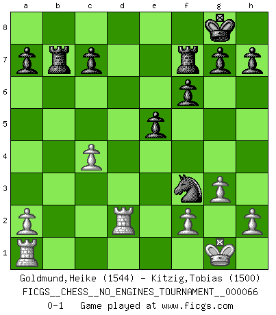 Last move : 0-1 2014 February 9 16:31:40 [Event "FICGS__CHESS__NO_ENGINES_TOURNAMENT__000066"] [Site "FICGS"] [Date "2013.10.12"] [Round "1"] [White "Goldmund,Heike"] [Black "Kitzig,Tobias"] [Result "0-1"] [WhiteElo "1544"] [BlackElo "1500"] 1.e4 e5 2.Nf3 Nc6 3.Bc4 Be7 4.c3 Nf6 5.d3 O-O 6.O-O d6 7.Re1 Bg4 8.Nbd2 d5 9.exd5 Nxd5 10.Bxd5 Qxd5 11.Ne4 Rad8 12.Bg5 Bxf3 13.Qxf3 Bxg5 14.Nxg5 f6 15.Qxd5+ Rxd5 16.Ne6 Rf7 17.c4 Rxd3 18.Nc5 Rd2 19.Nxb7 Rxb2 20.g3 Rxb7 21.Red1 Nd4 22.Rd2 Nf3+ 0-1 Hungarian defense Kingside Castling by player Black (move 5) Kingside Castling by player White (move 6) Player Black won this chess game. Follow this game move after move (download)Without error there can be no brilliancy. (Emanuel Lasker) Ich kämpfe solange mein Gegner einen Fehler machen kann. (Emanuel Lasker) Puntos débiles o agujeros en la posición de tu oponente deben de ser ocupados por piezas, no Peones. (Siegbert Tarrasch) Des combinaisons [dans le jeu d'échecs] pareilles à des mélodies. Je crois entendre pour ainsi dire la musique des coups... (Vladimir Nabokov) There is a very easy way to return from a casino with a small fortune : go there with a large one. (Jack Yelton)