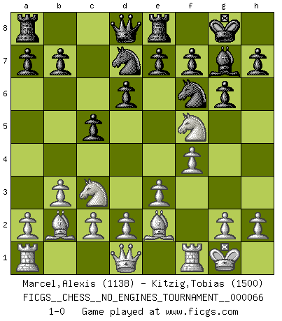 Last move : 1-0 2013 October 26 7:38:50 [Event "FICGS__CHESS__NO_ENGINES_TOURNAMENT__000066"] [Site "FICGS"] [Date "2013.10.12"] [Round "1"] [White "Marcel,Alexis"] [Black "Kitzig,Tobias"] [Result "1-0"] [WhiteElo "1138"] [BlackElo "1500"] 1.f4 Nf6 2.Nf3 g6 3.e3 Bg7 4.Be2 O-O 5.O-O Re8 6.b3 d6 7.Bb2 Bf5 8.Nc3 Nbd7 9.Nd4 c5 10.Nxf5 1-0 Bird's Opening Kingside Castling by player Black (move 4) Kingside Castling by player White (move 5) Player White won this chess game. Follow this game move after move (download)Fischer wanted to give the Russians a taste of their own medicine. (Larry Evans) Man braucht nicht immer den besten Zug zu spielen: Ein Zug muß aktiv, unternehmungslustig, korrekt und schön sein. (David Bronstein) Mis oponentes también hacen buenas movidas. A veces yo no tomo esas cosas en consideración. (Bobby Fischer) La guerre est enfant de la passion, la passion est enfant du narcissisme et le narcissisme est l'enfant. (...) Une autre partie ? (Thibault de Vassal) They say poker is a zero-sum game. It must be, because every time I play my sum ends up zero. (Max Shapiro)