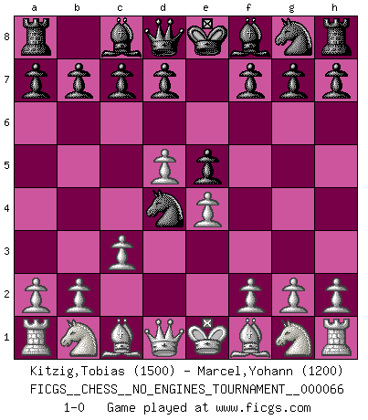 Last move : 1-0 2013 November 27 20:6:4 [Event "FICGS__CHESS__NO_ENGINES_TOURNAMENT__000066"] [Site "FICGS"] [Date "2013.10.12"] [Round "1"] [White "Kitzig,Tobias"] [Black "Marcel,Yohann"] [Result "1-0"] [WhiteElo "1500"] [BlackElo "1200"] 1.e4 Nc6 2.d4 e5 3.d5 Nd4 4.c3 1-0 This chess game has been lost on time (started : 2013.10.12 20:16:13) KP : Nimzovich defense Player White won this chess game. Follow this game move after move (download)I am the best player in the world and I am here to prove it. (Bobby Fischer) Wenn Du absolut nicht mehr weißt, was Du tun sollst, dann ist es Zeit für Panik. (John van der Wiel) Diferente gente reacciona diferentemente en aceptar la derrota. (Bobby Fischer) La vie et les Echecs sont tous les deux une lutte constante. (Lasker) The Internet is so big, so powerful and pointless that for some people it is a complete substitute for life. (Andrew Brown)