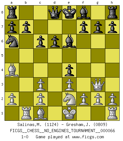 Last move : 1-0 2014 February 11 1:4:51 [Event "FICGS__CHESS__NO_ENGINES_TOURNAMENT__000066"] [Site "FICGS"] [Date "2013.10.12"] [Round "1"] [White "Salinas,Marcelo"] [Black "Gresham,Jonathan"] [Result "1-0"] [WhiteElo "1124"] [BlackElo "0809"] 1.e3 Nc6 2.Qf3 Nf6 3.d4 e5 4.d5 e4 5.Qh3 d6 6.Qg3 Nxd5 7.Nc3 Ncb4 8.Bb5+ c6 9.Ba4 Nxc3 10.bxc3 Na6 11.Ne2 Be6 12.Rb1 1-0 Van't Kruijs Opening Player White won this chess game. Follow this game move after move (download)Bobby Fischer is the greatest Chess player who has ever lived. (Ken Smith) Wenn Du nicht kämpfst, um anderen etwas zu beweisen, sondern nur für Dich selbst, dann bist du fast unbesiegbar. (Garry Kasparov) Alguna parte de un error es siempre correcto. (Savielly Tartakover) Les Echecs ont trois composantes : le temps, l'espace et le matériel en dernier. (Mikhail Tal) Remember : Your focus determines your reality. (Qui-Gon Jinn in Star Wars ep.1)
