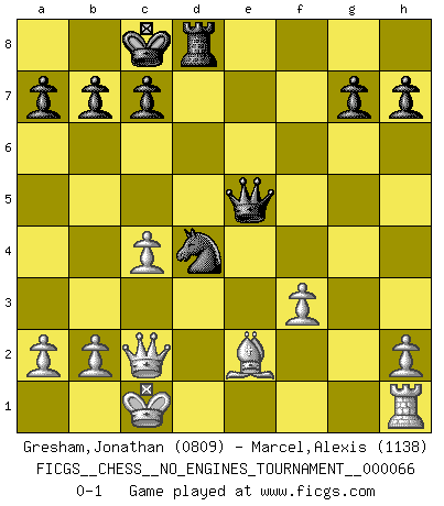 Last move : 0-1 2013 October 14 23:23:24 [Event "FICGS__CHESS__NO_ENGINES_TOURNAMENT__000066"] [Site "FICGS"] [Date "2013.10.12"] [Round "1"] [White "Gresham,Jonathan"] [Black "Marcel,Alexis"] [Result "0-1"] [WhiteElo "0809"] [BlackElo "1138"] 1.c4 f5 2.Nc3 Nf6 3.f4 e5 4.fxe5 Ne4 5.Nxe4 fxe4 6.d4 exd3 7.exd3 Bc5 8.Nf3 Nc6 9.Bg5 Be7 10.Bxe7 Qxe7 11.d4 d6 12.Qa4 Bd7 13.Qb3 O-O-O 14.O-O-O dxe5 15.dxe5 Bg4 16.Rxd8+ Rxd8 17.Be2 Bxf3 18.gxf3 Qxe5 19.Qc2 Nd4 0-1 English : Anglo-Dutch defense Queenside Castling by player Black (move 13) Queenside Castling by player White (move 14) Player Black won this chess game. Follow this game move after move (download)Chess is not like life... it has rules ! (Mark Pasternak) Wenn Capablanka heute auf der Schachbühne erscheinen würde, hätte er ein halbes Jahr gebraucht um sich die Schachtheorie anzueignen. Und dann hätte er alles und jeden besiegt. (Mikhail Moiseyevich Botvinik) Del Ajedrez se ha dicho que la vida no es lo suficientemente larga para él, pero eso es culpa de la vida, no del Ajedrez. (William Ewart Napier) L'ordinateur a tué l'originalité. Il n'y a plus guère d'aventures sur l'échiquier. (Jacob Murray) I can't decide which is riskier; taking crazy risks, or taking advice on crazy risks from a crazy risk taker. (Gregory House in House M.D.)