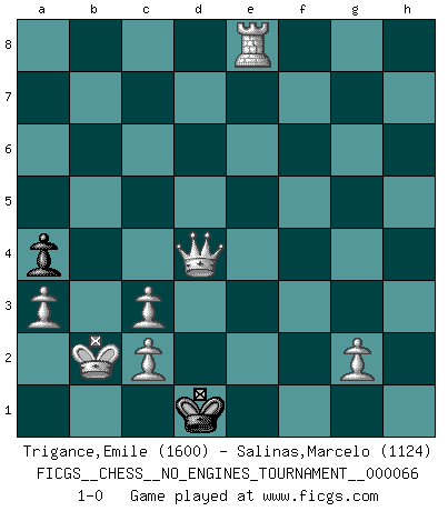 Last move : 1-0 2014 April 30 8:44:21 [Event "FICGS__CHESS__NO_ENGINES_TOURNAMENT__000066"] [Site "FICGS"] [Date "2013.10.12"] [Round "1"] [White "Trigance,Emile"] [Black "Salinas,Marcelo"] [Result "1-0"] [WhiteElo "1600"] [BlackElo "1124"] 1.e4 e6 2.d4 d6 3.Nf3 Nf6 4.Nc3 e5 5.dxe5 dxe5 6.Qxd8+ Kxd8 7.Nxe5 Be6 8.Bg5 Bb4 9.a3 Bxc3+ 10.bxc3 h6 11.O-O-O Ke8 12.Bxf6 gxf6 13.Nd3 Nc6 14.Nc5 Na5 15.Nxe6 fxe6 16.Bb5+ c6 17.Ba4 Nc4 18.Bb3 b5 19.Bxc4 bxc4 20.Rd6 Ke7 21.Rxc6 Rac8 22.Ra6 Rc7 23.Rd1 Rd8 24.Rxd8 Kxd8 25.Rxe6 Rf7 26.Rc6 Kd7 27.Rxc4 f5 28.Ra4 Kc8 29.Rc4+ Kb7 30.f3 fxe4 31.Rxe4 Rc7 32.Kb2 a5 33.Re6 Rh7 34.f4 Kc7 35.Ra6 Rf7 36.Ra7+ Kd6 37.Rxf7 Ke6 38.Rh7 Kf5 39.Rxh6 Kxf4 40.Rg6 a4 41.h4 Kf5 42.h5 Ke5 43.h6 Kf5 44.Rg8 Kf4 45.h7 Ke3 46.h8Q Kd2 47.Re8 Kd1 48.Qd4+ 1-0 Lengfellner system Queenside Castling by player White (move 11) 10 pieces endgame at move 39 : White KRPPPPPP , Black KP WHITE : King + 1 Rook 6 Pawns BLACK : King + 1 Pawn 9 pieces endgame at move 39 : White KRPPPPP , Black KP WHITE : King + 1 Rook 5 Pawns BLACK : King + 1 Pawn Promotion Queen by player White (move 46) Player White won this chess game. Follow this game move after move (download)No Chess Grandmaster is normal; they only differ in the extent of their madness. (Viktor Korchnoi) Ja, jede Frau in Holland liebt mich bestimmt, und alle Männer hassen mich. (Loek van Wely) Puntos débiles o agujeros en la posición de tu oponente deben de ser ocupados por piezas, no Peones. (Siegbert Tarrasch) 'L'échange des dames est un coup dur pour les deux adversaires...' Un journaliste lors d'une partie du match Spassky-Fischer Who needs drugs and alcohol if he can play Big Chess at FICGS ? (Heinz-Georg Lehnhoff)