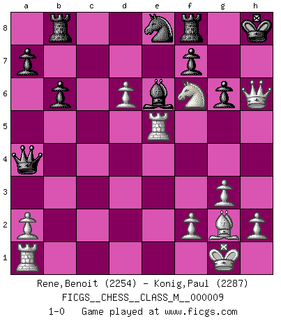 Last move : 1-0 2007 April 27 4:4:20 [Event "FICGS__CHESS__CLASS_M__000009"] [Site "FICGS"] [Date "2007.02.07"] [Round "1"] [White "Rene,Benoit"] [Black "Konig,Paul"] [Result "1-0"] [WhiteElo "2254"] [BlackElo "2287"] 1.c4 Nf6 2.g3 g6 3.Bg2 d5 4.Nf3 Bg7 5.O-O O-O 6.cxd5 Nxd5 7.Nc3 Nxc3 8.bxc3 c6 9.d4 Nd7 10.e4 Qa5 11.Qc2 c5 12.Bf4 Nf6 13.Rfe1 Nh5 14.Bg5 Bf6 15.e5 Bxg5 16.Nxg5 Ng7 17.Qb2 h6 18.Ne4 cxd4 19.cxd4 Rb8 20.d5 Kh8 21.d6 exd6 22.exd6 b6 23.Nf6 Be6 24.Re5 Qa4 25.Qd2 Ne8 26.Qxh6+ 1-0 English, 1...Nf6 (Anglo-Indian defense) Kingside Castling by player White (move 5) Kingside Castling by player Black (move 5) Player White won this chess game. Follow this game move after move (download)On the chessboard, lies and hypocrisy do not survive long. (Emanuel Lasker) Das Blackmar-Diemer-Gambit verändert den ganzen Menschen! (Emil Joseph Diemer) El jugador blanco perdió porque fallo en recordar la coreccta continuación y tuvo que pensar por sí mismo las movidas. (Siegbert Tarrasch) Les échecs sont un jeu par leur forme, un art par leur essence et une science par sa difficulté d'acquisition. Ils peuvent vous procurer autant de plaisir qu'un bon livre ou une belle musique, mais vous n'aurez une réelle joie que si vous arrivez à bien jouer. (Tigran Petrosian) There are two types of people in this world, good and bad. The good sleep better, but the bad seem to enjoy the waking hours much more. (Woody Allen)
