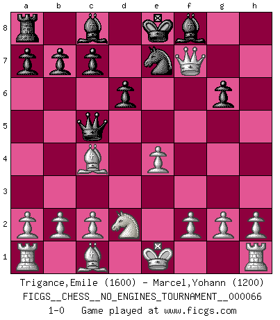 Last move : 1-0 2014 January 3 22:30:5 [Event "FICGS__CHESS__NO_ENGINES_TOURNAMENT__000066"] [Site "FICGS"] [Date "2013.10.12"] [Round "1"] [White "Trigance,Emile"] [Black "Marcel,Yohann"] [Result "1-0"] [WhiteElo "1600"] [BlackElo "1200"] 1.e4 Nc6 2.d4 e5 3.dxe5 Nxe5 4.Nf3 f6 5.Nxe5 fxe5 6.Qh5+ g6 7.Qxe5+ Qe7 8.Qxh8 Qb4+ 9.Nd2 Ne7 10.Bc4 Qc5 11.Qxh7 d6 12.Qf7+ 1-0 This chess game has been lost on time (started : 2013.10.12 20:16:13) KP : Nimzovich defense Player White won this chess game. Follow this game move after move (download)Chess is as much a mystery as women. (Purdy) Im Wettkampf zwischen starken Meistern kommen Fehler sehr selten vor, deshalb ist es mit bloßem Warten nicht getan. (José Raúl Capablanca) La táctica fluye a partir de una posición superior. (Bobby Fischer) Je crois qu'il existe des manières très spécifiques de jouer efficacement contre une machine. Evidemment, nous n'avons aucune chance en technique pure, parce que l'ordinateur calcule de manière parfaite. Mais lorsque nous faisons appel à notre cerveau, en utilisant l'intuition et la compréhension, alors nous restons beaucoup plus forts. (Anatoli Karpov) History is the quarrels of popes and kings, with wars or pestilences in every page; the men all so good for nothing, and hardly any women at all. (Jane Austen)