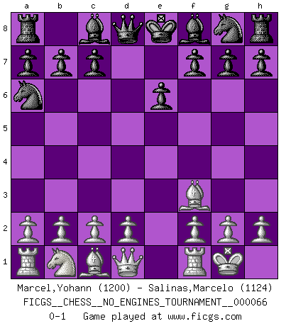 Last move : 0-1 2013 November 28 20:7:13 [Event "FICGS__CHESS__NO_ENGINES_TOURNAMENT__000066"] [Site "FICGS"] [Date "2013.10.12"] [Round "1"] [White "Marcel,Yohann"] [Black "Salinas,Marcelo"] [Result "0-1"] [WhiteElo "1200"] [BlackElo "1124"] 1.Nf3 e6 2.e4 d5 3.Be2 dxe4 4.O-O exf3 5.Bxf3 Na6 0-1 This chess game has been lost on time (started : 2013.10.12 20:16:13) Reti Opening Kingside Castling by player White (move 4) Player Black won this chess game. Follow this game move after move (download)Fischer was a master of clarity and a king of artful positioning. His opponents would see where he was going but were powerless to stop him. (Bruce Pandolfini) Wir irren allesamt, nur jeder irrt anders. (Georg Christoph Lichtenberg) Un jugador que es sorprendido, esta derrotado a medias. (Proverbio) Votre prénom est 'Tactique', votre deuxième prénom est 'Tactique' et votre nom est 'Tactique'. (Ken Smith) Art is not a thing, it is a way. (Elbert Hubbard)