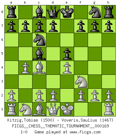 Last move : 1-0 2013 November 22 7:37:51 [Event "FICGS__CHESS__THEMATIC_TOURNAMENT__000169"] [Site "FICGS"] [Date "2013.10.12"] [Round "1"] [White "Kitzig,Tobias"] [Black "Voveris,Saulius"] [Result "1-0"] [WhiteElo "1500"] [BlackElo "1467"] 1.e4 e5 2.Nf3 Nc6 3.Bc4 Bc5 4.b4 1-0 This chess game has been lost on time (started : 2013.10.12 23:25:37) Evans gambit declined Player White won this chess game. Follow this game move after move (download)The older I grow, the more I value Pawns. (Keres) Ich spiele 70 Eröffnungssysteme. (Viktor Kortschnoi) En manos de Fischer's, una diminuta ventaja teórica es tan buena como tener una Reina de ventaja. (Isaac Kashdan) Le jeu d'échecs est comme rejeté hors du temps. (Antoine de Saint-Exupéry) Either move or be moved. (Ezra Pound)