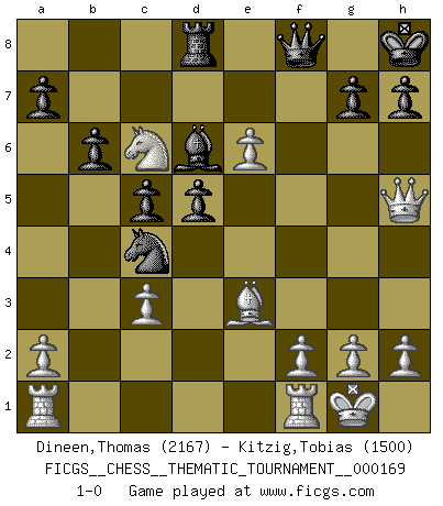 Last move : 1-0 2014 January 29 20:24:15 [Event "FICGS__CHESS__THEMATIC_TOURNAMENT__000169"] [Site "FICGS"] [Date "2013.10.12"] [Round "1"] [White "Dineen,Thomas"] [Black "Kitzig,Tobias"] [Result "1-0"] [WhiteElo "2167"] [BlackElo "1500"] 1.e4 e5 2.Nf3 Nc6 3.Bc4 Bc5 4.b4 Bxb4 5.c3 Be7 6.d4 d6 7.Qb3 Nf6 8.Ng5 O-O 9.Nxf7 Rxf7 10.Bxf7+ Kh8 11.Be3 Nxe4 12.O-O Bd7 13.d5 Na5 14.Qb4 Qf8 15.Be6 Bxe6 16.dxe6 b6 17.Qxe4 Rd8 18.Nd2 c6 19.Nb3 d5 20.Qxe5 Bd6 21.Qh5 Nc4 22.Nd4 c5 23.Nc6 1-0 Evans gambit : 5...Be7 Kingside Castling by player Black (move 8) Kingside Castling by player White (move 12) Player White won this chess game. Follow this game move after move (download)All I want to do, ever, is just play Chess. (Bobby Fischer) Das Zentrum ist der Balkan des Schachbretts - Kriegshandlungen können in jedem Moment ausbrechen. (Aaron Nimzowitsch) Debes de llevar a tu oponente hacia un profundo y obscuro bosque donde 2+2=5, y el camino que conduce a la salida es suficientemente ancho para solamente uno. (Mikhail Tal) Les échecs, c'est l'imagination. (David Bronstein) The bottom line is always the bottom line. (Johann Piek)