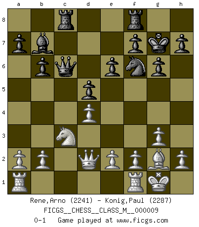 Last move : 0-1 2007 May 11 2:38:26 [Event "FICGS__CHESS__CLASS_M__000009"] [Site "FICGS"] [Date "2007.02.07"] [Round "1"] [White "Rene,Arno"] [Black "Konig,Paul"] [Result "0-1"] [WhiteElo "2241"] [BlackElo "2287"] 1.d4 Nf6 2.Nf3 d5 3.g3 g6 4.Bg2 Bg7 5.O-O O-O 6.c4 e6 7.Qc2 b6 8.Ne5 c6 9.Bg5 Bb7 10.cxd5 cxd5 11.Nc3 Nc6 12.Qd2 Qe8 13.Nxc6 Qxc6 14.Bh6 Rac8 15.Bxg7 Kxg7 0-1 Queen's pawn game Kingside Castling by player White (move 5) Kingside Castling by player Black (move 5) Player Black won this chess game. Follow this game move after move (download)Of Chess it has been said that life is not long enough for it, but that is the fault of life, not Chess. (William Ewart Napier) In der Schule lernt man nichts. Es ist nur Zeitverschwendung. (Robert James Fischer) Estaba muy claro de que el punto vulnerable del Gran Maestro Americano (Bobby Fischer) radicaba en las posiciones de doble filo, colgantes, irracionales, donde el siempre falló en encontrar un triunfo aún en una posición de clara victoria. (Efim Geller) Toutes choses étant égales, c'est la conviction qui gagne. Alliée à une volonté de vaincre, elle sert de détonateur, suscite des idées, disperse les doutes et aide à penser clairement. (Robert Fischer) The Internet is so big, so powerful and pointless that for some people it is a complete substitute for life. (Andrew Brown)