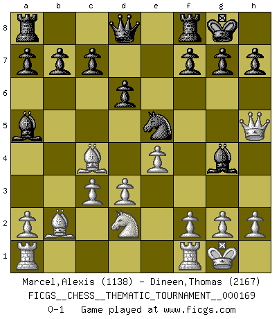 Last move : 0-1 2013 October 17 18:43:22 [Event "FICGS__CHESS__THEMATIC_TOURNAMENT__000169"] [Site "FICGS"] [Date "2013.10.12"] [Round "1"] [White "Marcel,Alexis"] [Black "Dineen,Thomas"] [Result "0-1"] [WhiteElo "1138"] [BlackElo "2167"] 1.e4 e5 2.Nf3 Nc6 3.Bc4 Bc5 4.b4 Bxb4 5.O-O Nf6 6.d3 O-O 7.c3 Ba5 8.Bb2 d6 9.Nbd2 Nh5 10.Nxe5 Nxe5 11.Qxh5 Bg4 0-1 Evans gambit Kingside Castling by player White (move 5) Kingside Castling by player Black (move 6) Player Black won this chess game. Follow this game move after move (download)Chess is a terrible game. If you have no center, your opponent has a freer position. If you do have a center, then you really have something to worry about ! (Siegbert Tarrasch) Ein Remis kann durch Wiederholung von drei Zügen oder durch einen schlechte Zug erreicht werden. (Savielly Grigorievitsch Tartakower) El Ajedrez hace al hombre ser mas sabio y ver mas claro. (Vladimir Putin) Je crois qu'il existe des manières très spécifiques de jouer efficacement contre une machine. Evidemment, nous n'avons aucune chance en technique pure, parce que l'ordinateur calcule de manière parfaite. Mais lorsque nous faisons appel à notre cerveau, en utilisant l'intuition et la compréhension, alors nous restons beaucoup plus forts. (Anatoli Karpov) A good teacher is like a candle - it consumes itself to light the way for others. (Author unknown)