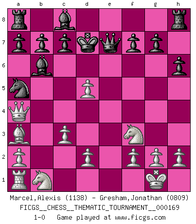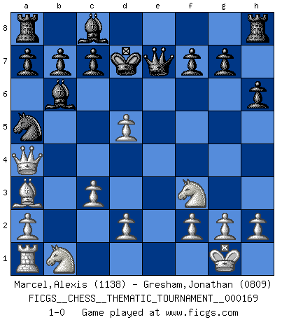 Last move : 1-0 2013 October 14 18:0:11 [Event "FICGS__CHESS__THEMATIC_TOURNAMENT__000169"] [Site "FICGS"] [Date "2013.10.12"] [Round "1"] [White "Marcel,Alexis"] [Black "Gresham,Jonathan"] [Result "1-0"] [WhiteElo "1138"] [BlackElo "0809"] 1.e4 e5 2.Nf3 Nc6 3.Bc4 Bc5 4.b4 Bxb4 5.O-O h6 6.c3 Ba5 7.Ba3 Nf6 8.Re1 Bb6 9.Qb3 d5 10.Bxd5 Nxd5 11.exd5 Na5 12.Rxe5+ Kd7 13.Re7+ Qxe7 14.Qa4+ 1-0 Evans gambit Kingside Castling by player White (move 5) Player White won this chess game. Follow this game move after move (download)Is Bobby Fischer quite sane ? (Salo Flohr) Ein bischen Romantik kann weder im Schach noch in der Liebe schaden. Also versuche ich mich ab und zu daran zu erinnern. (Nigel Short) No es una movida, aún la mejor movida que tu debas buscar, sino un plan comprensible. (Eugene Znosko-Borovsky) Si je n'étais pas joueur d'échecs, je serais le meilleur dans quelque chose d'autre. (Anatoli Karpov) The Internet is the world's largest library. It's just that all the books are on the floor. (John Allen Paulos)