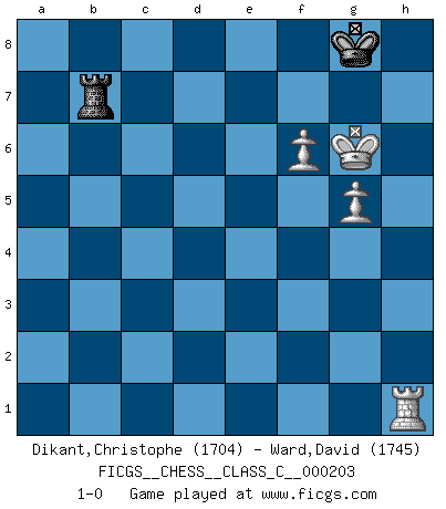 Last move : 1-0 2015 April 13 5:2:24 [Event "FICGS__CHESS__CLASS_C__000203"] [Site "FICGS"] [Date "2013.10.13"] [Round "1"] [White "Dikant,Christophe"] [Black "Ward,David"] [Result "1-0"] [WhiteElo "1704"] [BlackElo "1745"] 1.d4 Nf6 2.Nf3 g6 3.e3 Bg7 4.Be2 O-O 5.O-O d6 6.c4 b6 7.Nc3 Bb7 8.Nd2 Nbd7 9.Bf3 Bxf3 10.Qxf3 e5 11.d5 a6 12.e4 Nh5 13.g3 a5 14.Qe2 a4 15.Nf3 Nc5 16.Be3 Nd7 17.Qc2 a3 18.b3 Re8 19.Rae1 Nf8 20.Bc1 Qd7 21.Nb5 f5 22.exf5 gxf5 23.Nh4 e4 24.Ng2 Ng6 25.Qe2 Nf6 26.Nf4 c6 27.dxc6 Qxc6 28.Nxg6 hxg6 29.Bf4 Red8 30.Rc1 Ng4 31.Rfd1 Ne5 32.Bxe5 Bxe5 33.Rd5 Kf7 34.Rcd1 Rd7 35.Qd2 Ke6 36.Qe3 Kf6 37.h4 Kf7 38.h5 Kf6 39.Qh6 Rg8 40.hxg6 R8g7 41.Kf1 Ke6 42.Qg5 Qb7 43.g4 f4 44.Qf5+ Ke7 45.Qxe4 Kd8 46.f3 Qb8 47.Qf5 Ke8 48.Nxd6+ Bxd6 49.Qe6+ Kf8 50.Rxd6 Rxd6 51.Qxd6+ Qxd6 52.Rxd6 Re7 53.Rxb6 Re3 54.Rf6+ Kg7 55.Rxf4 Rc3 56.c5 Rc1+ 57.Ke2 Rc2+ 58.Ke3 Rxa2 59.Ra4 Ra1 60.Kf4 a2 61.c6 Rc1 62.Rxa2 Rxc6 63.Re2 Rb6 64.Re3 Kxg6 65.Kg3 Kf6 66.f4 Rb4 67.Rc3 Kg6 68.Rc6+ Kf7 69.f5 Rxb3+ 70.Kf4 Rb4+ 71.Kg5 Rb7 72.Rh6 Kg7 73.f6+ Kg8 74.Rh1 Rb4 75.Kf5 Rb5+ 76.Kg6 Rb7 77.g5 1-0 King's Indian : East Indian defense Kingside Castling by player Black (move 4) Kingside Castling by player White (move 5) 10 pieces endgame at move 58 : White KRPPPPP , Black KRP WHITE : King + 1 Rook 5 Pawns BLACK : King + 1 Rook 1 Pawn 9 pieces endgame at move 62 : White KRPPPPP , Black KR WHITE : King + 1 Rook 5 Pawns BLACK : King + 1 Rook 8 pieces endgame at move 62 : White KRPPPP , Black KR WHITE : King + 1 Rook 4 Pawns BLACK : King + 1 Rook 7 pieces endgame at move 64 : White KRPPP , Black KR WHITE : King + 1 Rook 3 Pawns BLACK : King + 1 Rook 6 pieces endgame at move 69 : White KRPP , Black KR WHITE : King + 1 Rook 2 Pawns BLACK : King + 1 Rook Player White won this chess game. Follow this game move after move (download)When you see a good move, look for a better one. (Emanuel Lasker) Der Freibauer hat für mich eine Seele, genau wie der Mensch, Wünsche, die unerkannt in ihm schlummern, und Befürchtungen, von deren Existenz er selbst kaum ahnt. (Aaron Nimzowitsch) Hay dos clases de hombres: aquellos que se conforman en dejarse llevar por las circunstancias y que juegan barajas y aquellos decididos a controlar las circunstancias y que juegan al Ajedrez. (Mortimer Collins) Aidez vos pièces, elles vous aideront. (Paul Morphy) There are two kinds of tragedy in this world, one is not getting what you want and the other is getting. (Lord of war)