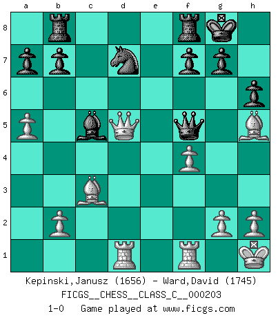 Last move : 1-0 2014 April 5 13:2:6 [Event "FICGS__CHESS__CLASS_C__000203"] [Site "FICGS"] [Date "2013.10.13"] [Round "1"] [White "Kepinski,Janusz"] [Black "Ward,David"] [Result "1-0"] [WhiteElo "1656"] [BlackElo "1745"] 1.d4 d5 2.c4 Nf6 3.Nf3 e6 4.e3 c5 5.cxd5 exd5 6.Bb5+ Nc6 7.Ne5 Qc7 8.Qa4 Bd7 9.Nxd7 Nxd7 10.dxc5 Bxc5 11.O-O O-O 12.Nc3 Nb6 13.Qc2 Bd6 14.f4 d4 15.Bxc6 dxc3 16.Be4 h6 17.Qxc3 Rac8 18.Qb3 Bc5 19.Kh1 Rce8 20.Bf3 Rb8 21.Bd2 Qe7 22.a4 Rfd8 23.Bc3 Qxe3 24.a5 Nd7 25.Rae1 Qd3 26.Bh5 Rf8 27.Rd1 Qf5 28.Qd5 1-0 QGD : Marshall defense Kingside Castling by player White (move 11) Kingside Castling by player Black (move 11) Player White won this chess game. Follow this game move after move (download)The passion for playing Chess is one of the most unaccountable in the world. (H.G. Wells) Mein erstes Ziel war nicht, die Partie zu gewinnen, sondern eine Figur zu opfern. -- der junge (Wilhelm Steinitz) Bobby Fischer es el jugador de Ajedrez mas grande que jamás haya existido. (Ken Smith) La conception d'un plan est le processus par lequel un joueur exploite les avantages de sa position tout en s'efforçant d'en réduire au minimum les inconvénients. Afin de garantir le succès, un plan doit toujours se fonder sur un diagnostic objectif des particularités d'une position. La conception d'un plan est d'autant plus difficile que la position est équilibrée, et grandement facilitée lorsqu'il n'existe qu'un seul plan susceptible de répondre aux exigences de la position. (Harry Golombek) There are 10 types of people in this world: those who understand binary and those who don't. (Anonymous)