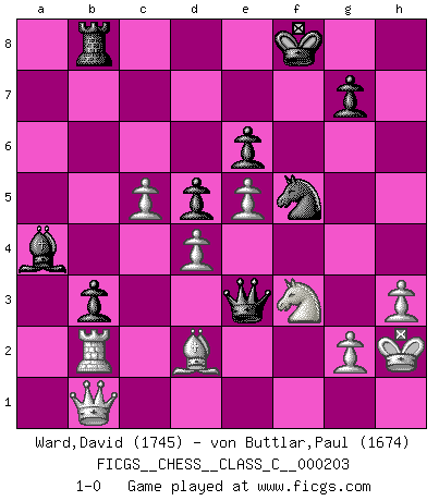 Last move : 1-0 2015 January 23 17:46:6 [Event "FICGS__CHESS__CLASS_C__000203"] [Site "FICGS"] [Date "2013.10.13"] [Round "1"] [White "Ward,David"] [Black "von Buttlar,Paul"] [Result "1-0"] [WhiteElo "1745"] [BlackElo "1674"] 1.e4 e6 2.d4 d5 3.Nd2 Nf6 4.e5 Nfd7 5.f4 c5 6.c3 Nc6 7.Ndf3 cxd4 8.cxd4 Qb6 9.Ne2 f6 10.a3 Be7 11.Nc3 O-O 12.Na4 Qd8 13.Be3 a6 14.b4 b5 15.Nc5 Nb6 16.Be2 Nc4 17.Bf2 fxe5 18.fxe5 Ra7 19.O-O Rc7 20.Bd3 Nb2 21.Bxh7+ Kxh7 22.Qc2+ Kg8 23.Qxb2 Qe8 24.Qd2 Qh5 25.Nd3 Bd8 26.Nf4 Qg4 27.Be3 Qf5 28.Rac1 Ne7 29.Nd3 Qg4 30.h3 Qh5 31.Nf4 Qf5 32.Qd3 Bd7 33.Rxc7 Bxc7 34.Qc3 Bb6 35.Nd3 Qe4 36.Nc5 Bxc5 37.bxc5 Nc6 38.Bf2 a5 39.Nd2 Qe2 40.Nb3 b4 41.axb4 axb4 42.Qd2 Qc4 43.Qb2 Ne7 44.Nd2 Qb5 45.Nf3 Nf5 46.Rb1 Rb8 47.Qb3 Qe2 48.Rb2 Qc4 49.Nd2 Qc1+ 50.Kh2 Ba4 51.Qa2 Qc3 52.Nf3 b3 53.Qb1 Kf8 54.Be1 Qe3 55.Bd2 1-0 French : Tarrasch, Closed variation Kingside Castling by player Black (move 11) Kingside Castling by player White (move 19) Player White won this chess game. Follow this game move after move (download)A man that will take back a move at Chess will pick a pocket. (Richard Fenton) Darum geht es im Schach. Einen Tag gibst du deinem Gegner eine Lektion, am nächsten Tag gibt er dir eine. (Robert James Fischer) El juego de Fischer siempre fue nítido, racional y brillante. Uno de los mejores por siempre. (Dave Regis) Le moment que je préfère le plus dans une rencontre, c'est celui où je sens que la personnalité de l'adversaire se brise. (Robert Fischer) Just because you do not take an interest in politics doesn't mean politics won't take an interest in you. (Pericles 430 B.C.)