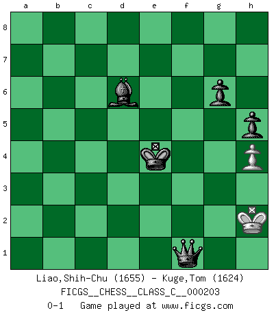 Last move : 0-1 2014 February 25 7:26:26 [Event "FICGS__CHESS__CLASS_C__000203"] [Site "FICGS"] [Date "2013.10.13"] [Round "1"] [White "Liao,Shih-Chu"] [Black "Kuge,Tom"] [Result "0-1"] [WhiteElo "1655"] [BlackElo "1624"] 1.e4 e5 2.Nf3 Nc6 3.d4 Qf6 4.d5 Nce7 5.Nc3 Ng6 6.Bd3 Bb4 7.Bd2 Nf4 8.Bxf4 Qxf4 9.O-O Nf6 10.Ne2 Qh6 11.Ng3 d6 12.a3 Bc5 13.Nf5 Bxf5 14.exf5 O-O 15.b4 Bb6 16.c4 e4 17.Bxe4 Nxe4 18.Qd3 Rfe8 19.Rae1 Nf6 20.Qc3 a5 21.Rxe8+ Nxe8 22.c5 axb4 23.axb4 dxc5 24.bxc5 Ba5 25.Qa3 Qf4 26.Qd3 Nf6 27.d6 cxd6 28.cxd6 Rd8 29.Rd1 Bb4 30.g3 Qxd6 31.Qxd6 Rxd6 32.Rb1 Rb6 33.h3 h6 34.g4 Ne4 35.Kg2 Bc5 36.Rxb6 Bxb6 37.Ne5 Nxf2 38.Nd7 Ba7 39.f6 Ne4 40.fxg7 Kxg7 41.h4 Nc5 42.Nxc5 Bxc5 43.Kf3 b5 44.Ke2 h5 45.g5 Kg6 46.Kf3 Kf5 47.g6 fxg6 48.Kg3 Ke4 49.Kg2 b4 50.Kh3 b3 51.Kg2 b2 52.Kh3 b1Q 53.Kg3 Qf1 54.Kh2 Bd6+ 0-1 Scotch Opening Kingside Castling by player White (move 9) Kingside Castling by player Black (move 14) 10 pieces endgame at move 40 : White KNPP , Black KBNPPP WHITE : King + 1 Knight 2 Pawns BLACK : King + 1 Bishop 1 Knight 3 Pawns 9 pieces endgame at move 42 : White KNPP , Black KBPPP WHITE : King + 1 Knight 2 Pawns BLACK : King + 1 Bishop 3 Pawns 8 pieces endgame at move 42 : White KPP , Black KBPPP WHITE : King + 2 Pawns BLACK : King + 1 Bishop 3 Pawns 7 pieces endgame at move 47 : White KP , Black KBPPP WHITE : King + 1 Pawn BLACK : King + 1 Bishop 3 Pawns Promotion Queen by player Black (move 52) Player Black won this chess game. Follow this game move after move (download)I know people who have all the will in the world, but still can't play good Chess. (Bobby Fischer) Ich erzeugte keinen Neid, da mich die Schachspieler als Musiker und die Musiker als Schachspieler betrachteten. (Mark Taimanov) El Ajedrez hace al hombre ser mas sabio y ver mas claro. (Vladimir Putin) Les Cavaliers se révèlent fort utiles dans les positions fermées. D'habitude, les Fous sont un peu plus forts que les Cavaliers dans les positions ouvertes. Qu'on le veuille ou non, il restera toujours des exceptions ! Patience, use the Force, think ! (Obi-Wan Kenobi in Star Wars ep.2)