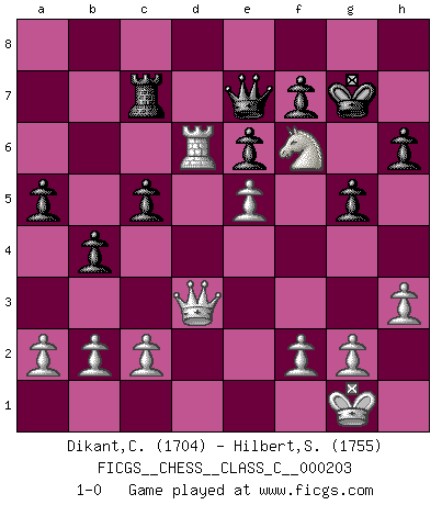 Last move : 1-0 2014 February 9 19:37:8 [Event "FICGS__CHESS__CLASS_C__000203"] [Site "FICGS"] [Date "2013.10.13"] [Round "1"] [White "Dikant,Christophe"] [Black "Hilbert,Stephan J."] [Result "1-0"] [WhiteElo "1704"] [BlackElo "1755"] 1.d4 b5 2.e4 Bb7 3.Nd2 Nf6 4.Bd3 e6 5.Ngf3 a6 6.O-O c5 7.dxc5 Bxc5 8.e5 Ng4 9.h3 Nh6 10.Ne4 Be7 11.Bxh6 gxh6 12.Qd2 Bg5 13.Nfxg5 hxg5 14.Nd6+ Kf8 15.Nxb7 Qe7 16.Nd6 Nc6 17.Be4 Rd8 18.Bxc6 dxc6 19.Qe3 h6 20.Ne4 Kg7 21.Rad1 Rd5 22.Nc3 Rxd1 23.Rxd1 c5 24.Rd6 Rc8 25.Qd2 Rc7 26.Ne4 b4 27.Nf6 a5 28.Qd3 1-0 Polish defense Kingside Castling by player White (move 6) Player White won this chess game. Follow this game move after move (download)It is the aim of the modern school, not to treat every position according to one general law, but according to the principle inherent in the position. (Richard Reti) Ich möchte Schüler heranbilden, die das Vermögen haben, selbst zu denken und Kritik zu üben. (Emanuel Lasker) Ciertamente, de todas la drogas del mundo, el Ajedrez debe ser el mas placentero permamentemente. (Assiac) Un footballeur joue avec ses pieds, parfois avec sa tête. Un joueur d'échecs ne joue qu'avec sa tête. Et quand il ne joue plus, il meurt. (Jacob Murray) A bird doesn't sing because it has an answer, it sings because it has a song. (Maya Angelou)