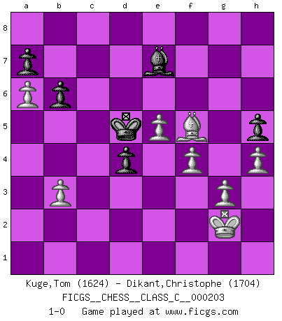 Last move : 1-0 2013 December 8 12:17:42 [Event "FICGS__CHESS__CLASS_C__000203"] [Site "FICGS"] [Date "2013.10.13"] [Round "1"] [White "Kuge,Tom"] [Black "Dikant,Christophe"] [Result "1-0"] [WhiteElo "1624"] [BlackElo "1704"] 1.e4 d5 2.Nf3 dxe4 3.Ng5 Nf6 4.Bc4 e6 5.Nc3 Nbd7 6.Qe2 Nb6 7.Bb3 Be7 8.Ncxe4 Nxe4 9.Nxe4 O-O 10.d3 Nd5 11.O-O c5 12.Kh1 b6 13.a4 Bb7 14.Bd2 Qc7 15.f4 Nf6 16.Bc3 Bxe4 17.dxe4 Qc6 18.Bxf6 Bxf6 19.e5 Be7 20.Bc4 Rad8 21.a5 Rb8 22.Bb5 Qc7 23.a6 Rfd8 24.Rad1 Rxd1 25.Rxd1 Rd8 26.Rd3 Rxd3 27.Bxd3 Qc6 28.h3 g6 29.Kh2 Kg7 30.b3 f5 31.Bc4 Kf7 32.Qd3 h5 33.g3 Kg7 34.Bb5 Qd5 35.Qxd5 exd5 36.Kg2 Kf7 37.Bc6 Ke6 38.h4 c4 39.Be8 cxb3 40.cxb3 d4 41.Bxg6 Kd5 42.Bxf5 1-0 Scandinavian (centre counter) defense Kingside Castling by player Black (move 9) Kingside Castling by player White (move 11) Player White won this chess game. Follow this game move after move (download)After black's reply to 1.e4 with 1..e5, leaves him always trying to get into the game. (Howard Staunton) Kann Schach nicht schließlich das Nationalspiel der Deutschen werden? Und welche weiteren Ausblicke bieten sich dann dar! Welche Hebung des allgemeinen Kultur-Niveaus, ja der Moral, wenn das Schachbrett den Kartentisch verdrängen würde! Wahrlich, ein Ziel, des Schweißes der Edlen wert! (Siegbert Tarrasch) Yo nunca en mi vida he jugado la Defensa Francesa, que viene siendo la más aburrida de todas las Aperturas. (Wilhelm Steinitz) Nous sommes les pions de la mystérieuse partie d'Echecs jouée par Dieu. Il nous déplace, nous arrête, nous pousse encore, puis nous lance un à un dans la boîte du Néant. Epitaphe sur la tombe de David Janowsky (1868-1927). If you have any trouble condescending, find a Unix user to show you how it's done. (Scott Adams)