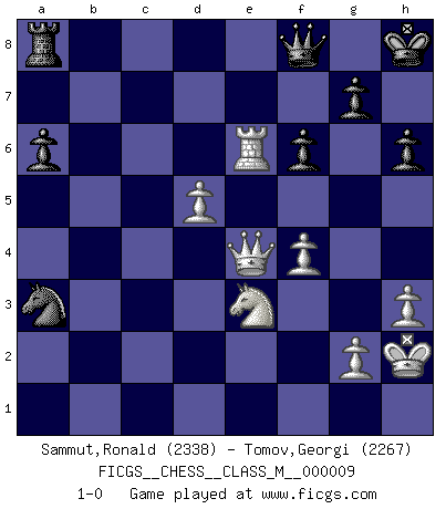 Last move : 1-0 2007 July 7 9:55:28 [Event "FICGS__CHESS__CLASS_M__000009"] [Site "FICGS"] [Date "2007.02.07"] [Round "1"] [White "Sammut,Ronald"] [Black "Tomov,Georgi"] [Result "1-0"] [WhiteElo "2338"] [BlackElo "2267"] 1.e4 e5 2.Nf3 Nf6 3.Nxe5 d6 4.Nf3 Nxe4 5.d4 d5 6.Bd3 Nc6 7.O-O Be7 8.c4 Nb4 9.Be2 O-O 10.Nc3 Bf5 11.a3 Nxc3 12.bxc3 Nc6 13.Re1 Re8 14.cxd5 Qxd5 15.Bf4 Rac8 16.Bd3 Qd7 17.Rb1 b6 18.d5 Bxd3 19.Qxd3 Bf6 20.c4 Ne7 21.Be5 Bxe5 22.Nxe5 Qd6 23.Rbd1 a6 24.h3 Ra8 25.Qf3 f6 26.Ng4 Ng6 27.Re6 Qf8 28.Rde1 Rxe6 29.Rxe6 b5 30.Ne3 Ne5 31.Qe4 Kh8 32.Kh2 Nf7 33.f4 Nd6 34.Qd4 bxc4 35.Qc5 h6 36.Qxc7 Nb5 37.Qxc4 Nxa3 38.Qe4 1-0 Petrov : Classical attack Kingside Castling by player White (move 7) Kingside Castling by player Black (move 9) Player White won this chess game. Follow this game move after move (download)Chess is life. (Bobby Fischer) Immer nach dem besten Zug zu suchen ist ziemlich unpraktisch. (Nigel Short) Un buen sacrificio es aquel que aunque no sea necesariamente sólido, deja a tu oponente aturdido y confuso. (Rudolph Spielmann) Si rien de grave n'est détecté lors de l'analyse d'une position, on joue alors le coup. Seconde règle de Blumenfeld. The only sure thing about luck is that it will change. (Wilson Mizner)