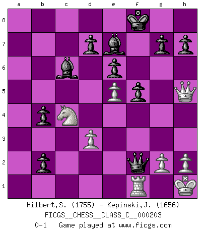 Last move : 0-1 2014 February 9 19:37:26 [Event "FICGS__CHESS__CLASS_C__000203"] [Site "FICGS"] [Date "2013.10.13"] [Round "1"] [White "Hilbert,Stephan J."] [Black "Kepinski,Janusz"] [Result "0-1"] [WhiteElo "1755"] [BlackElo "1656"] 1.b4 b5 2.e3 a6 3.Bb2 Nf6 4.Nf3 e6 5.a3 Bb7 6.Be2 c5 7.O-O cxb4 8.a4 bxa4 9.Rxa4 Be7 10.c3 Nc6 11.Nd4 Nxd4 12.cxd4 a5 13.Bf3 Nd5 14.Be4 Bc6 15.Ra1 Nxe3 16.fxe3 Bxe4 17.d3 Bb7 18.Qh5 O-O 19.Nd2 a4 20.d5 Bxd5 21.e4 Bc6 22.Qg4 f6 23.e5 f5 24.Qh5 Qb6+ 25.Kh1 a3 26.Nc4 axb2 27.Rxa8 Qf2 28.Rxf8+ Kxf8 0-1 Polish (Sokolsky) opening Kingside Castling by player White (move 7) Kingside Castling by player Black (move 18) Player Black won this chess game. Follow this game move after move (download)Man is a frivolous, a specious creature, and like a Chess player, cares more for the process of attaining his goal than for the goal itself. (Dostoyevsky) Sehr viele beherrschen heutzutage das große Einmalseins des Schachspiels und kennen sogar dessen Logarithmentafeln auswendig - deshalb sollte man hin und wieder zu beweisen trachten, dass zwei mal zwei auch fünf sein kann. (Mikhail Nekhemyevich Tal) ¿Quién es tu oponente esta tarde? Esta tarde mi oponente son las piezas negras. (Akiba Rubinstein) Je crois qu'il existe des manières très spécifiques de jouer efficacement contre une machine. Evidemment, nous n'avons aucune chance en technique pure, parce que l'ordinateur calcule de manière parfaite. Mais lorsque nous faisons appel à notre cerveau, en utilisant l'intuition et la compréhension, alors nous restons beaucoup plus forts. (Anatoli Karpov) Statistics can be made to prove anything - even the truth. (Author unknown)