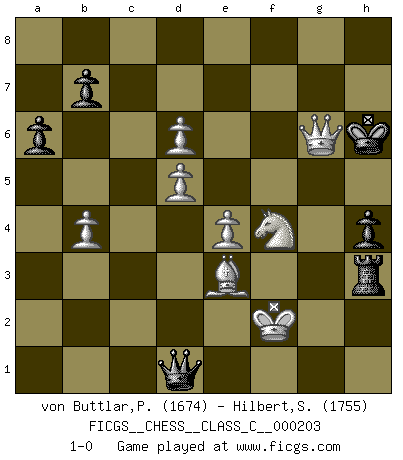 Last move : 1-0 2014 February 8 22:49:38 [Event "FICGS__CHESS__CLASS_C__000203"] [Site "FICGS"] [Date "2013.10.13"] [Round "1"] [White "von Buttlar,Paul"] [Black "Hilbert,Stephan J."] [Result "1-0"] [WhiteElo "1674"] [BlackElo "1755"] 1.c4 d6 2.d4 g6 3.e4 Bg7 4.Nc3 Nf6 5.f3 O-O 6.Be3 c6 7.Bd3 Na6 8.Nge2 Nc7 9.O-O Nd7 10.Qd2 e5 11.d5 Na6 12.a3 Nc7 13.b4 a6 14.Bc2 Nf6 15.Rad1 cxd5 16.Nxd5 Ncxd5 17.cxd5 Bd7 18.Rc1 Nh5 19.g4 Nf6 20.Ng3 Bb5 21.Bd3 h5 22.g5 Bxd3 23.gxf6 Bxf1 24.fxg7 Re8 25.Rxf1 Kxg7 26.Rc1 Qh4 27.Kg2 Qe7 28.Bb6 Rac8 29.Rc3 h4 30.Rxc8 Rxc8 31.Ne2 Qd7 32.h3 Qa4 33.Qd3 Rc2 34.f4 Ra2 35.fxe5 Rxa3 36.Qd4 Qc2 37.exd6 Kh7 38.Kf2 Rxh3 39.Qe5 Qd3 40.Qf4 Qd1 41.Qxf7+ Kh6 42.Be3+ Kh5 43.Nf4+ Kh6 44.Qxg6+ 1-0 English Opening Kingside Castling by player Black (move 5) Kingside Castling by player White (move 9) Player White won this chess game. Follow this game move after move (download)Daring ideas are like Chess men moved forward. They may be beaten, but they may start a winning game. (Johann Wolfgang von Goethe) Schach ist Krieg, im Schach geht es um testosterongesteuerte Urschreie. (Garry Kasparov) Hay dos clases de hombres: aquellos que se conforman en dejarse llevar por las circunstancias y que juegan barajas y aquellos decididos a controlar las circunstancias y que juegan al Ajedrez. (Mortimer Collins) Ce n'est pas pour s'amuser qu'il joue aux échecs : il célèbre un culte. (Vladimir Nabokov) Life is like a ten-speed bicycle: most of us have gears we never use. (Charles M. Schulz)