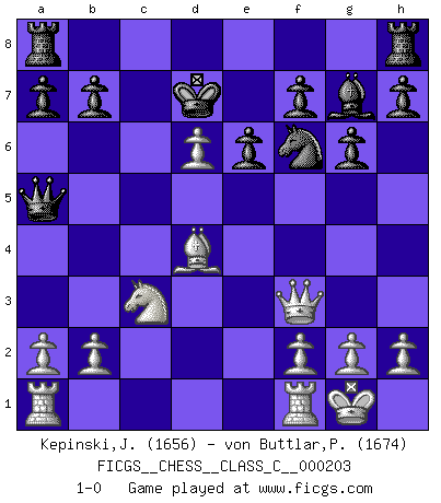 Last move : 1-0 2014 January 7 19:42:30 [Event "FICGS__CHESS__CLASS_C__000203"] [Site "FICGS"] [Date "2013.10.13"] [Round "1"] [White "Kepinski,Janusz"] [Black "von Buttlar,Paul"] [Result "1-0"] [WhiteElo "1656"] [BlackElo "1674"] 1.c4 c6 2.e4 d5 3.cxd5 cxd5 4.exd5 Qxd5 5.Nc3 Qe5+ 6.Be2 Bd7 7.Nf3 Qa5 8.d4 Nf6 9.Ne5 Nc6 10.Nxd7 Nxd7 11.d5 Nce5 12.O-O g6 13.Be3 Nf6 14.Bb5+ Ned7 15.d6 e6 16.Bd4 Bg7 17.Bxd7+ Kxd7 18.Qf3 1-0 English : Caro-Kann defensive system Kingside Castling by player White (move 12) Player White won this chess game. Follow this game move after move (download)Chess is like war on a board. (Bobby Fischer) Das Schachspiel ist ein See, in welchem eine Mücke baden und ein Elefant ertrinken kann. (Emanuel Lasker) Fischer era un maestro de claridad y un Rey del posicionamiento astuto. Sus oponentes podían ver hacia donde se dirigía pero eran impotentes para detenerlo. (Bruce Pandolfini) C'est une question de caractère, Beaucoup de gens perdent leur motivation très vite. D'autres, ils sont rares, peuvent la conserver très longtemps. J'aime les échecs, encore aujourd'hui je suis heureux d'analyser des parties. J'aime toujours gagner, je déteste encore perdre. Bien jouer est important pour mon intégrité intellectuelle et morale. Et puis les échecs vivent en ce moment une période historique grâce à Internet. Ils se développent dans les systèmes éducatifs à travers le monde. Ils sortent de leur ghetto, et c'est mon rôle de mener à bien cette révolution. (Gary Kasparov) Lamb in skin of tiger, still fears the wolf. (Chinese proverb)