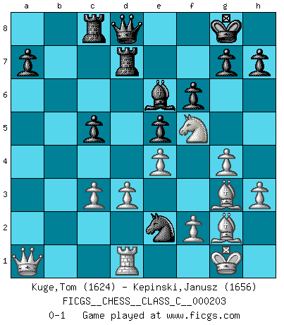 Last move : 0-1 2013 December 23 19:52:45 [Event "FICGS__CHESS__CLASS_C__000203"] [Site "FICGS"] [Date "2013.10.13"] [Round "1"] [White "Kuge,Tom"] [Black "Kepinski,Janusz"] [Result "0-1"] [WhiteElo "1624"] [BlackElo "1656"] 1.e4 e6 2.Nf3 d5 3.d3 c5 4.Nc3 Nc6 5.Bf4 d4 6.Ne2 Bd6 7.Qd2 e5 8.Bg5 f6 9.Bh4 Nge7 10.h3 O-O 11.g4 Be6 12.Bg3 Bc7 13.Nh4 Ba5 14.c3 dxc3 15.Nxc3 b5 16.Be2 b4 17.Nd1 b3 18.Nc3 Nd4 19.O-O bxa2 20.Nf5 Nb3 21.Qd1 Nxa1 22.Qxa1 Nc6 23.Nxa2 Rc8 24.Nc3 Rf7 25.Rd1 Nd4 26.Bf1 Rd7 27.Bg2 Bxc3 28.bxc3 Ne2+ 0-1 French defense Kingside Castling by player Black (move 10) Kingside Castling by player White (move 19) Player Black won this chess game. Follow this game move after move (download)The passed pawn is a criminal, who should be kept under lock and key. Mild measures, such as police surveillance, are not sufficient. (Nimzovitch) Ich habe kein Problem mit Frauen, sondern nur mit dem Niveau ihres Schachspiels (Judith Polgar) El Ajedrez es una guerra en un tablero. El objetivo es aplastar la mente del oponente. (Bobby Fischer) Fischer est le meilleur joueur du monde et Karpov n'est qu'un joueur de bistrot. (Garry Kasparov, agé de 16 ans) Good luck. You're gonna need it. (Han Solo in Star Wars ep.6)