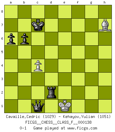 Last move : 0-1 2013 October 22 15:11:27 [Event "FICGS__CHESS__CLASS_F__000138"] [Site "FICGS"] [Date "2013.10.13"] [Round "1"] [White "Cavaille,Cedric"] [Black "Kehayov,Yulian"] [Result "0-1"] [WhiteElo "1029"] [BlackElo "1051"] 1.d4 d5 2.Nc3 e6 3.f4 Nf6 4.e3 Nc6 5.Bd3 Bb4 6.Bd2 O-O 7.Qe2 Re8 8.O-O-O h6 9.Nf3 a6 10.Ne5 Nxe5 11.fxe5 Nh7 12.Nb1 f6 13.Bxb4 b6 14.exf6 Nxf6 15.g4 e5 16.dxe5 Bxg4 17.Qg2 Bxd1 18.exf6 Qxf6 19.Bc3 Qf7 20.Kxd1 Rxe3 21.Rg1 g5 22.h4 c5 23.Bd2 Re5 24.hxg5 hxg5 25.Bxg5 Qh5+ 26.Qg4 Qxg4+ 27.Rxg4 Kf7 28.Rf4+ Ke6 29.Bh4 c4 30.Rf6+ Kd7 31.Rf7+ Ke6 32.Rf6+ Kd7 33.Bf5+ Kc7 34.Bg3 Rae8 35.Bxe5+ Rxe5 36.Be6 Kd6 37.Bg8 Kc5 38.Re6 Rg5 39.Re8 Rg1+ 40.Kd2 Rxb1 41.Rc8+ Kd6 42.b3 cxb3 43.Rd8+ Kc7 44.Rxd5 bxa2 45.Bh7 a1Q 46.c3 Rd1+ 47.Ke3 Rxd5 48.c4 Qc3+ 49.Ke2 Rd2+ 50.Ke1 Qc1+ 0-1 Queen's pawn : Chigorin variation Kingside Castling by player Black (move 6) Queenside Castling by player White (move 8) 10 pieces endgame at move 44 : White KRBPP , Black KRPPP WHITE : King + 1 Rook 1 Bishop 2 Pawns BLACK : King + 1 Rook 3 Pawns 9 pieces endgame at move 44 : White KRBP , Black KRPPP WHITE : King + 1 Rook 1 Bishop 1 Pawn BLACK : King + 1 Rook 3 Pawns Promotion Queen by player Black (move 45) 8 pieces endgame at move 47 : White KBP , Black KQRPP WHITE : King + 1 Bishop 1 Pawn BLACK : King + 1 Queen 1 Rook 2 Pawns Player Black won this chess game. Follow this game move after move (download)When asked, -How is that you pick better moves than your opponents?, I responded: I'm very glad you asked me that, because, as it happens, there is a very simple answer. I think up my own moves, and I make my opponent think up his. (Alexander Alekhine) Irgendwie scheint mir sonntags früh um 9 Uhr der Killerinstinkt verloren gegangen zu sein. (Alexej Shirov) El Ajedrez es en su esencia, un juego. En su forma, un arte. Y en su ejecución, una ciencia. (Baron Tassilo) Tout change constamment, y compris dans le monde des Echecs. (Botvinnik) Life is the sum of all your choices. (Albert Camus)
