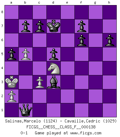 Last move : 0-1 2014 March 27 4:55:10 [Event "FICGS__CHESS__CLASS_F__000138"] [Site "FICGS"] [Date "2013.10.13"] [Round "1"] [White "Salinas,Marcelo"] [Black "Cavaille,Cedric"] [Result "0-1"] [WhiteElo "1124"] [BlackElo "1029"] 1.e4 e5 2.Qf3 Nf6 3.Bc4 Nc6 4.Ne2 d6 5.Bb5 Bd7 6.Bxc6 Bxc6 7.d4 Bxe4 8.Qg4 Nxg4 9.Nbc3 Bg6 10.h3 Nf6 11.Bg5 exd4 12.Nxd4 h6 13.Bxf6 Qxf6 14.O-O-O O-O-O 15.f3 Re8 16.Nde2 Qf5 17.Nd4 Qg5+ 18.Kb1 Qxg2 19.Rhe1 Rxe1 20.Rxe1 Kd7 21.Nce2 Qxh3 22.Kc1 d5 23.c3 Bc5 24.b4 Bxd4 25.Nxd4 Re8 26.Rd1 Qg3 27.Kb2 Qf2+ 28.Kb3 Re1 29.Rxe1 Qxe1 30.f4 Qb1+ 31.Ka3 Bc2 32.b5 Bd3 33.f5 a5 34.f6 gxf6 0-1 This chess game has been lost on time (started : 2013.10.13 9:45:12) Variation Napoleon's Opening : Napoleon's Opening Queenside Castling by player White (move 14) Queenside Castling by player Black (move 14) Player Black won this chess game. Follow this game move after move (download)A thorough understanding of the typical mating continuations makes the most complicated sacrificial combinations leading up to them not only not difficult, but almost a matter of course. (Siegbert Tarrasch) Zum Sieg gelangt man nicht, wenn man gut, sondern nur wenn man besser spielt (Savielly Grigorievitsch Tartakower) La caracteristica mas importante en la posición del Ajedrez es la actividad de las piezas. Esto es absolutamente fundamental en todas las fases del juego: Apertura, Juego Medio y especialmente Finales. La limitación primordial en la actividad de una pieza, es la estructuración de los Peones. (Michael Stean) Votre seul travail dans les ouvertures est d'obtenir un milieu de partie jouable. (Lajos Portish) The absolute truth is the thing that makes people laugh. (Carl Reiner)