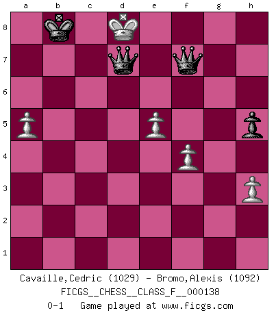Last move : 0-1 2013 October 20 18:3:2 [Event "FICGS__CHESS__CLASS_F__000138"] [Site "FICGS"] [Date "2013.10.13"] [Round "1"] [White "Cavaille,Cedric"] [Black "Bromo,Alexis"] [Result "0-1"] [WhiteElo "1029"] [BlackElo "1092"] 1.d4 d5 2.Nc3 Nf6 3.Bg5 h6 4.Bxf6 gxf6 5.e4 e6 6.e5 f5 7.f4 Nc6 8.Bb5 Bd7 9.g3 a6 10.Bxc6 Bxc6 11.Qd3 b5 12.Nf3 Be7 13.a3 Bb7 14.b3 c5 15.dxc5 Bxc5 16.b4 Bb6 17.Ne2 Qe7 18.Ned4 O-O-O 19.Qc3+ Kb8 20.Nc6+ Bxc6 21.Qxc6 Qa7 22.Qc3 Rc8 23.Qd2 Rhd8 24.Rc1 Be3 25.Qd1 Bxc1 26.Qxc1 d4 27.Ke2 d3+ 28.Ke1 dxc2 29.Ke2 Rc3 30.h3 Rd1 31.Rxd1 cxd1Q+ 32.Qxd1 Re3+ 33.Kf2 Rxa3 34.Qd4 Rxf3+ 35.Kxf3 Qxd4 36.g4 Qd3+ 37.Kg2 a5 38.bxa5 b4 39.gxf5 b3 40.fxe6 b2 41.exf7 Qe2+ 42.Kg3 Qe3+ 43.Kg4 h5+ 44.Kf5 b1Q+ 45.Kg5 Qg3+ 46.Kf6 Qg3g6+ 47.Ke7 Qb7+ 48.Ke8 Qg6xf7+ 49.Kd8 Qb7d7+ 0-1 Richter-Veresov attack Queenside Castling by player Black (move 18) Promotion Queen by player Black (move 31) 10 pieces endgame at move 41 : White KPPPPP , Black KQPP WHITE : King + 5 Pawns BLACK : King + 1 Queen 2 Pawns Promotion Queen by player Black (move 44) 9 pieces endgame at move 48 : White KPPPP , Black KQQP WHITE : King + 4 Pawns BLACK : King + 2 Queens 1 Pawn Player Black won this chess game. Follow this game move after move (download)Castle early and often. (Rob Sillars) Je mehr wir mit Computern analysieren, desto mehr glauben wir an Verteidigung. (Vladimir Kramnik) Un entendimiento minucioso de las típicas continuaciones de mate hacen de las mas complicadas combinaciones de sacrificio que conducen hacia ellas no solo no dificiles, sino casi un asunto de rutina. (Siegbert Tarrasch) Les Echecs sont affaire de jugement sensible. Savoir quand frapper et quand esquiver. (Fischer) If only people were all showed a certain minimum level of niceness; if only people didn't retract verbal draw offers (without draw box ticked) on ficgs; if only people didn't kill; if only people didn't run concentration / extermination camps, if only people didn't drop nuclear bombs on Hiroshima and Nagasaki, and so on - it would be a much more beautiful world. But sadly, things are not so... (Normajean Yates)