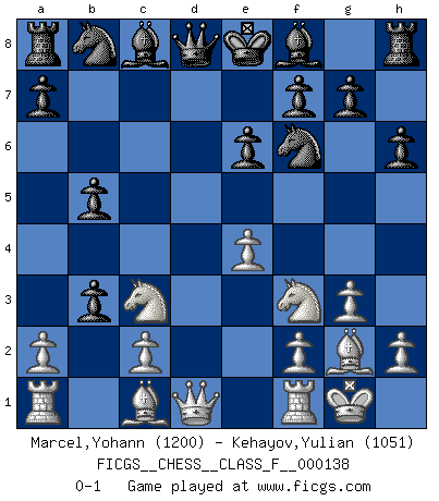 Last move : 0-1 2013 November 26 8:0:41 [Event "FICGS__CHESS__CLASS_F__000138"] [Site "FICGS"] [Date "2013.10.13"] [Round "1"] [White "Marcel,Yohann"] [Black "Kehayov,Yulian"] [Result "0-1"] [WhiteElo "1200"] [BlackElo "1051"] 1.Nf3 d5 2.g3 e6 3.Bg2 Nf6 4.O-O c5 5.Nc3 c4 6.d3 h6 7.e4 dxe4 8.dxe4 b5 9.b3 cxb3 0-1 This chess game has been lost on time (started : 2013.10.13 9:45:12) Reti : King's Indian attack (Barcza system) Kingside Castling by player White (move 4) Player Black won this chess game. Follow this game move after move (download)Life is a kind of Chess, with struggle, competition, good and ill events. (Benjamin Franklin) Ein bischen Romantik kann weder im Schach noch in der Liebe schaden. Also versuche ich mich ab und zu daran zu erinnern. (Nigel Short) Alekhine es un poeta que crea un trabajo de arte de algo que raramente inspiraría a otra persona a mandar una tarjeta postal. (Max Euwe) Le génie consiste à savoir transgresser les règles au moment opportun. (Teichmann) The various flowers seem good to different people. (Chinese proverb)