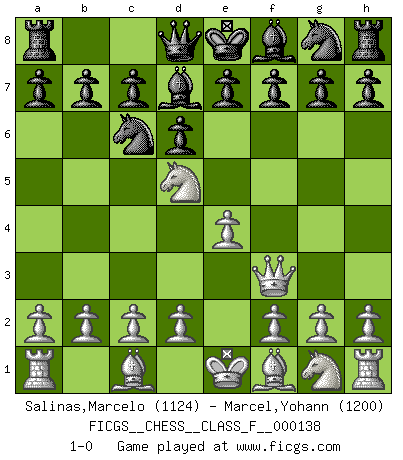 Last move : 1-0 2013 November 26 20:1:0 [Event "FICGS__CHESS__CLASS_F__000138"] [Site "FICGS"] [Date "2013.10.13"] [Round "1"] [White "Salinas,Marcelo"] [Black "Marcel,Yohann"] [Result "1-0"] [WhiteElo "1124"] [BlackElo "1200"] 1.e4 Nc6 2.Nc3 d6 3.Qf3 Bd7 4.Nd5 1-0 This chess game has been lost on time (started : 2013.10.13 9:45:12) KP : Nimzovich defense Player White won this chess game. Follow this game move after move (download)No Chess Grandmaster is normal; they only differ in the extent of their madness. (Viktor Korchnoi) Mein erstes Ziel war nicht, die Partie zu gewinnen, sondern eine Figur zu opfern. -- der junge (Wilhelm Steinitz) Hasta este punto, las blancas han seguido un análisis bien conocido. Pero ahora el hace un error fatal: empieza a usar su propia cabeza. (Siegbert Tarrasch) La vérité est comme le meilleur coup aux échecs : elle existe, mais il faut la chercher. (Arturo Perez-Reverte) Either move or be moved. (Ezra Pound)