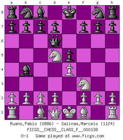 Last move : 0-1 2013 November 24 19:58:12 [Event "FICGS__CHESS__CLASS_F__000138"] [Site "FICGS"] [Date "2013.10.13"] [Round "1"] [White "Ruano,Pablo"] [Black "Salinas,Marcelo"] [Result "0-1"] [WhiteElo "0886"] [BlackElo "1124"] 1.e4 e5 2.Nf3 Qf6 3.Nc3 Bb4 4.Nd5 Qd6 0-1 This chess game has been lost on time (started : 2013.10.13 9:45:12) Greco defense Player Black won this chess game. Follow this game move after move (download)Even the laziest King flees wildly in the face of a double check ! (Aaron Nimzowitsch) Oft bringt ein stiller Zug das Erdbeben. (Richard Reti) Botvinnik trató de alejar el misterio referente al Ajedrez, siempre relacionandolo a situaciones de la vida diaria. Solía llamar al Ajedrez un problema inexacto típico, similar a aquellos en que la gente tiene siempre que resolver a cada día. (Garry Kasparov) Je ne suis pas le dernier à jouer lâchement des coups douteux pendant le zeïtnot de l'adversaire pour l'achever: en effet les coups qui font le plus peur sont ceux que l'on ne comprend pas. Je me fais souvent peur quand je joue. (Un professeur anonyme) Memory is a way of holding onto the things you love, the things you are, the things you never want to lose. (from the television show: The Wonder Years)
