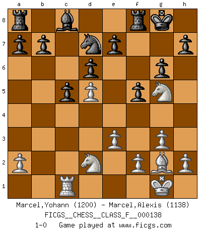 Last move : 1-0 2014 February 2 0:22:40 [Event "FICGS__CHESS__CLASS_F__000138"] [Site "FICGS"] [Date "2013.10.13"] [Round "1"] [White "Marcel,Yohann"] [Black "Marcel,Alexis"] [Result "1-0"] [WhiteElo "1200"] [BlackElo "1138"] 1.Nf3 f5 2.g3 Nf6 3.Bg2 g6 4.O-O Bg7 5.d4 O-O 6.Bg5 c5 7.e3 Qb6 8.Bxf6 Bxf6 9.c3 Qxb2 10.Nbd2 Qxc3 11.d5 Qxa1 12.Qxa1 Bxa1 13.Rxa1 d6 14.Rc1 Nd7 15.Ng5 1-0 Reti v Dutch Kingside Castling by player White (move 4) Kingside Castling by player Black (move 5) Player White won this chess game. Follow this game move after move (download)Fischer was a master of clarity and a king of artful positioning. His opponents would see where he was going but were powerless to stop him. (Bruce Pandolfini) Sitze auf Deine Hände. (Siegbert Tarrasch) No hay precio que no valga la pena por la cabellera del Rey enemigo. (Koblentz) Aux échecs, l'amour-propre est satisfait quand on remporte la victoire, mais il n'y a pas de honte à être battu. (Benjamin Franklin) There is far too much law for those who can afford it and far too little for those who cannot. (Derek Bok)