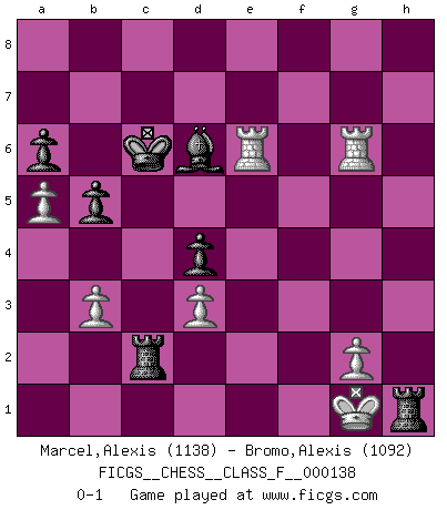 Last move : 0-1 2013 October 24 21:13:8 [Event "FICGS__CHESS__CLASS_F__000138"] [Site "FICGS"] [Date "2013.10.13"] [Round "1"] [White "Marcel,Alexis"] [Black "Bromo,Alexis"] [Result "0-1"] [WhiteElo "1138"] [BlackElo "1092"] 1.f4 d5 2.Nf3 Nc6 3.e3 Nf6 4.b3 Bf5 5.Bb2 h6 6.Be2 a6 7.O-O e6 8.Ne5 Nxe5 9.Bxe5 c5 10.Nc3 b6 11.a4 Ne4 12.Nxe4 Bxe4 13.d3 Bf5 14.Bg4 Bxg4 15.Qxg4 f6 16.Qg6+ Kd7 17.Qf7+ Kc8 18.a5 b5 19.e4 d4 20.Qxe6+ Qd7 21.Qxd7+ Kxd7 22.Bxd4 cxd4 23.e5 fxe5 24.fxe5 Ke6 25.Rfe1 g5 26.Re4 Rc8 27.Ra2 h5 28.h3 g4 29.hxg4 hxg4 30.Rxg4 Kxe5 31.Ra1 Rxc2 32.Re1+ Kd5 33.Rg5+ Kc6 34.Re6+ Bd6 35.R5g6 Rh1+ 0-1 Bird's Opening Kingside Castling by player White (move 7) Player Black won this chess game. Follow this game move after move (download)If your opponent cannot do anything active, then don't rush the position; instead you should let him sit there, suffer, and beg you for a draw. (Jeremy Silman) Ich habe die besten Aussichten, den ersten Preis zu gewinnen - denn jeder muss gegen Steinitz spielen, nur ich nicht! (Wilhelm Steinitz) Todavía soy una víctima del Ajedrez. Tiene toda la belleza del arte y mucho mas. No puede ser comercializado. El Ajedrez es mas puro que el arte en su posición social. (Marcel Duchamp) L'attaque fait le spectacle, la défense gagne les matchs. (Dicton footballistique) There are more things in heaven and earth than practically anywhere else. (Unknown)