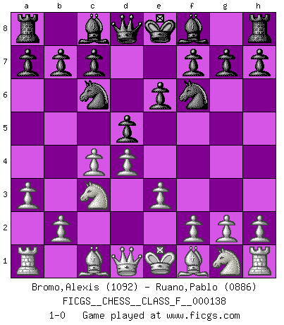 Last move : 1-0 2013 November 27 20:6:4 [Event "FICGS__CHESS__CLASS_F__000138"] [Site "FICGS"] [Date "2013.10.13"] [Round "1"] [White "Bromo,Alexis"] [Black "Ruano,Pablo"] [Result "1-0"] [WhiteElo "1092"] [BlackElo "0886"] 1.d4 Nf6 2.c4 d5 3.Nc3 e6 4.a3 Nc6 5.e3 1-0 This chess game has been lost on time (started : 2013.10.13 9:45:12) Queen's pawn game Player White won this chess game. Follow this game move after move (download)My God, Bobby Fischer plays so simply. (Alexei Suetin) Wenn ich mich einlogge, glauben die Leute gewöhnlich nicht, dass ich es selbst bin und sie fangen an, mir dumme Fragen zu stellen. Und wenn sie es glauben, stellen sie wieder andere dumme Fragen. (Judith Polgar) Fischer es una tragedia del Ajedrez Americano a la par con Morphy y Pillsbury. (Mig Greengard) La tactique est l'élément le plus important du milieu de jeu. (Siegbert Tarrasch) You have to believe in yourself. (Sun Tzu)