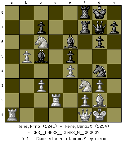 Last move : 0-1 2007 May 8 14:10:2 [Event "FICGS__CHESS__CLASS_M__000009"] [Site "FICGS"] [Date "2007.02.07"] [Round "1"] [White "Rene,Arno"] [Black "Rene,Benoit"] [Result "0-1"] [WhiteElo "2241"] [BlackElo "2254"] 1.d4 f5 2.Nf3 Nf6 3.g3 g6 4.Bg2 Bg7 5.O-O O-O 6.c3 d6 7.Nbd2 Nc6 8.Re1 e5 9.dxe5 dxe5 10.e4 f4 11.b4 a6 12.a4 fxg3 13.hxg3 Ng4 14.Ba3 Rf7 15.b5 Na5 16.Bb4 b6 17.Bxa5 bxa5 18.Nc4 Qf6 19.Re2 Be6 20.Nxa5 Bf8 21.Qf1 axb5 22.axb5 Bc5 23.Nc6 Raf8 24.Rd2 Qg7 0-1 Dutch Kingside Castling by player White (move 5) Kingside Castling by player Black (move 5) Player Black won this chess game. Follow this game move after move (download)Chess is a terrible game. If you have no center, your opponent has a freer position. If you do have a center, then you really have something to worry about ! (Siegbert Tarrasch) Wie kann ich Remis annehmen? Ich weiß ja gar nicht, wie ich stehe! (Fritz Sämisch) No soy una persona materialista y por eso, no resiento la falta o pérdida del dinero. La ausencia de cosas mundanas carece de importancia. Ya que el Ajedrez es una forma en la que puedo ser tan materialista como yo desee sin tener la necesidad de vender mi alma. (Jamie Walter Adams) A ce moment-là, je menaçais de comprendre la position ! (Clément L'Heureux) The meaning of life is that it is to be lived, and it is not to be traded and conceptualized and squeezed into a pattern of systems. (Bruce Lee)