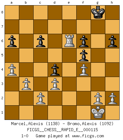 Last move : 1-0 2013 October 23 21:51:24 [Event "FICGS__CHESS__RAPID_E__000115"] [Site "FICGS"] [Date "2013.10.13"] [Round "1"] [White "Marcel,Alexis"] [Black "Bromo,Alexis"] [Result "1-0"] [WhiteElo "1138"] [BlackElo "1092"] 1.f4 d5 2.Nf3 Nc6 3.e3 Nf6 4.Bb5 Bd7 5.O-O a6 6.Bxc6 Bxc6 7.b3 h6 8.Bb2 e6 9.a4 Bb4 10.Nc3 Bxc3 11.Bxc3 Qd7 12.Ne5 Qe7 13.Nxc6 bxc6 14.Be5 O-O 15.Qe2 Ne4 16.d3 Nc3 17.Bxc3 f5 18.Qh5 c5 19.Be5 c6 20.Qg6 Rf6 21.Bxf6 Qxf6 22.Qxf6 gxf6 23.Rf3 Kf7 24.Rg3 d4 25.exd4 cxd4 26.Re1 Rg8 27.Rxg8 Kxg8 28.Rxe6 1-0 Bird's Opening Kingside Castling by player White (move 5) Kingside Castling by player Black (move 14) Player White won this chess game. Follow this game move after move (download)Is Bobby Fischer quite sane ? (Salo Flohr) Es liegt in der Natur, vernüftig zu denken und unlogisch zu handeln. (Anatole France) No hay precio que no valga la pena por la cabellera del Rey enemigo. (Koblentz) Si rien de grave n'est détecté lors de l'analyse d'une position, on joue alors le coup. Seconde règle de Blumenfeld. You must have a dream in order to have it come true. (A.P.J. Kalam)