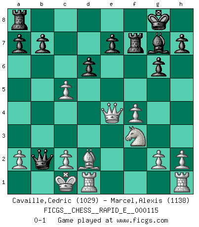 Last move : 0-1 2013 October 14 14:35:34 [Event "FICGS__CHESS__RAPID_E__000115"] [Site "FICGS"] [Date "2013.10.13"] [Round "1"] [White "Cavaille,Cedric"] [Black "Marcel,Alexis"] [Result "0-1"] [WhiteElo "1029"] [BlackElo "1138"] 1.d4 f5 2.f4 Nf6 3.Nc3 g6 4.e3 Bg7 5.Bd2 O-O 6.Qe2 d6 7.O-O-O Nbd7 8.e4 fxe4 9.Nxe4 Nxe4 10.Qxe4 Nf6 11.Qe1 Bg4 12.Be2 Bxe2 13.Qxe2 Nd5 14.Qe6+ Rf7 15.Qxd5 c6 16.Qe4 Qb6 17.Nf3 c5 18.dxc5 Qxb2+ 0-1 Dutch Kingside Castling by player Black (move 5) Queenside Castling by player White (move 7) Player Black won this chess game. Follow this game move after move (download)The passion for playing Chess is one of the most unaccountable in the world. (H.G. Wells) Sie bekommen vielleicht den Eindruck, dass die Spitzenspieler überhaupt gar nicht so stark sind. Aber das stimmt nicht. Es ist eine Illusion. Mit einem Computer an der Seite ist es sehr leicht, Urteile zu fällen, aber wenn man alleine am Brett sitzt, sieht die Sache ganz anders aus. (Vladimir Kramnik) Bobby Fischer es el mas grande genio de Ajedrez de todos los tiempos. (Alexander Kotov) Je ne suis pas le dernier à jouer lâchement des coups douteux pendant le zeïtnot de l'adversaire pour l'achever: en effet les coups qui font le plus peur sont ceux que l'on ne comprend pas. Je me fais souvent peur quand je joue. (Un professeur anonyme) There are lots of people who mistake their imagination for their memory. (Josh Bilings)